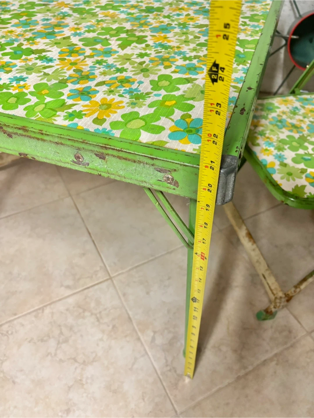 94Selling a super cute vintage folding table and chairs set! The table top and seats have a fun floral pattern. The table is about 35 inches long and 24 inches wide, and stands about 22 inches tall. It shows some wear and tear, but it's still got a lot of charm and would be perfect for a retro kitchen or kids' play area