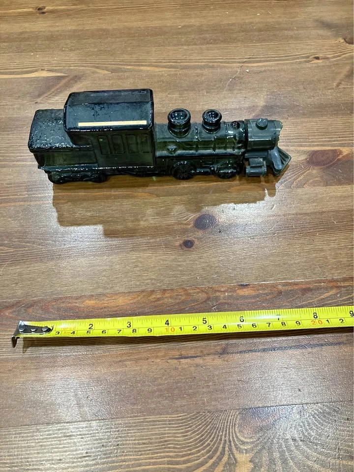 Vintage collectible green glass bottle shaped like a steam train engine. Nicely detailed with molded windows, wheels, and smokestacks, this unique novelty bottle makes a great display piece for collectors of trains, automobilia, or vintage glassware. 📏 Size: See measuring tape in photos for scale 🪞 Material: Green molded glass with detailed locomotive design Condition: Good vintage condition. No cracks or chips noted. Some light wear consistent with age. Perfect as a display piece, man cave décor, or gift for a train enthusiast or glass bottle collector.