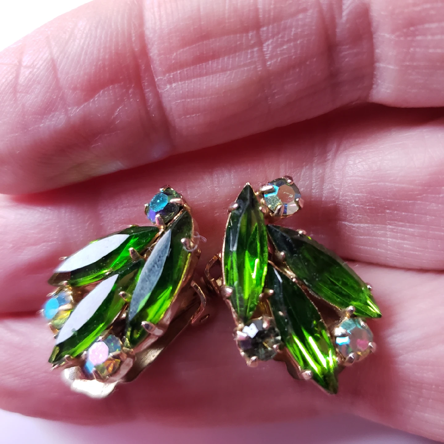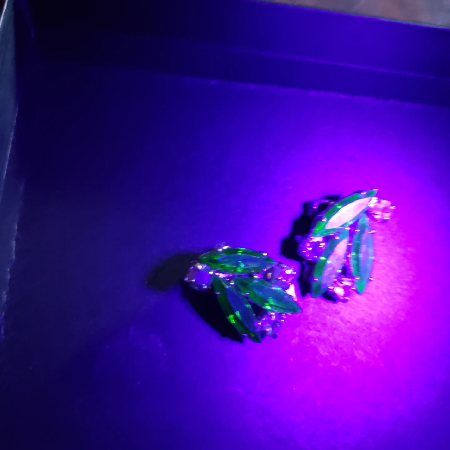 188Selling a pair of vintage clip-on earrings. They feature green rhinestones and a gold-tone metal. They are in good condition and ready to wear! they appear to respond to uv light.
