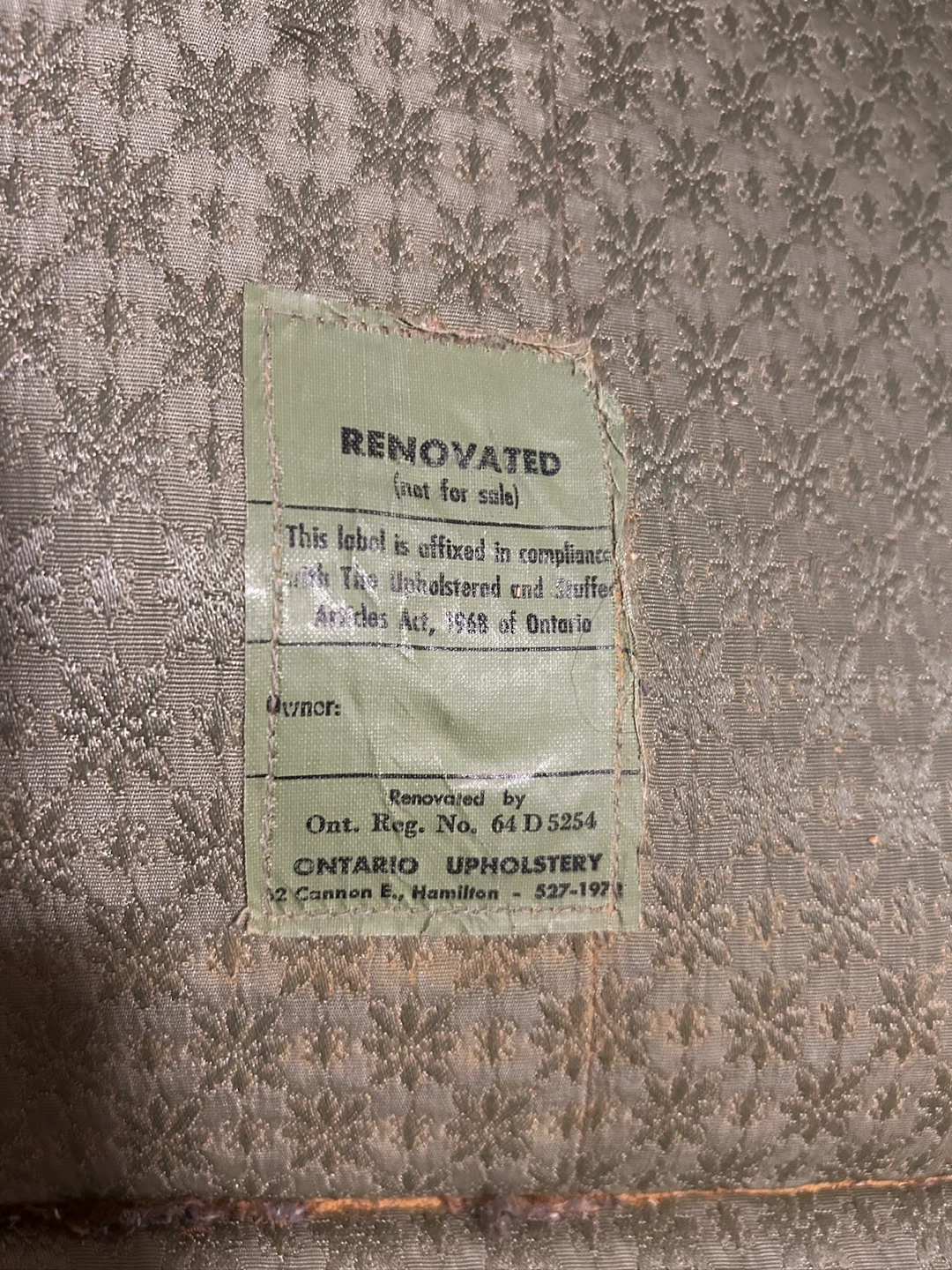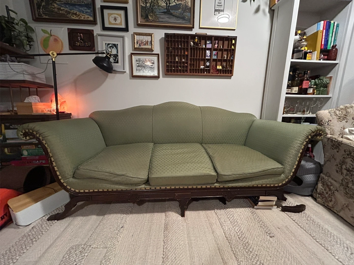 Selling a vintage green sofa. We purchased it years ago from the “Anne with an e” prop auction- it was used at aunt Josephine’s couch in the show! It's a beautiful piece with a unique design. The sofa has a renovated label from Ontario Upholstery. Perfect for adding a touch of vintage charm to your home! In need of repair. One of the legs and some of the frame is broken.