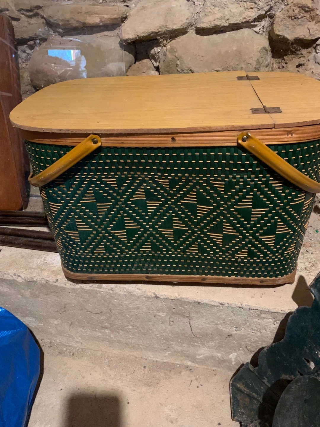 60Selling a vintage green wicker picnic basket with a wooden lid and handles. It is in good condition and perfect for picnics or storage!