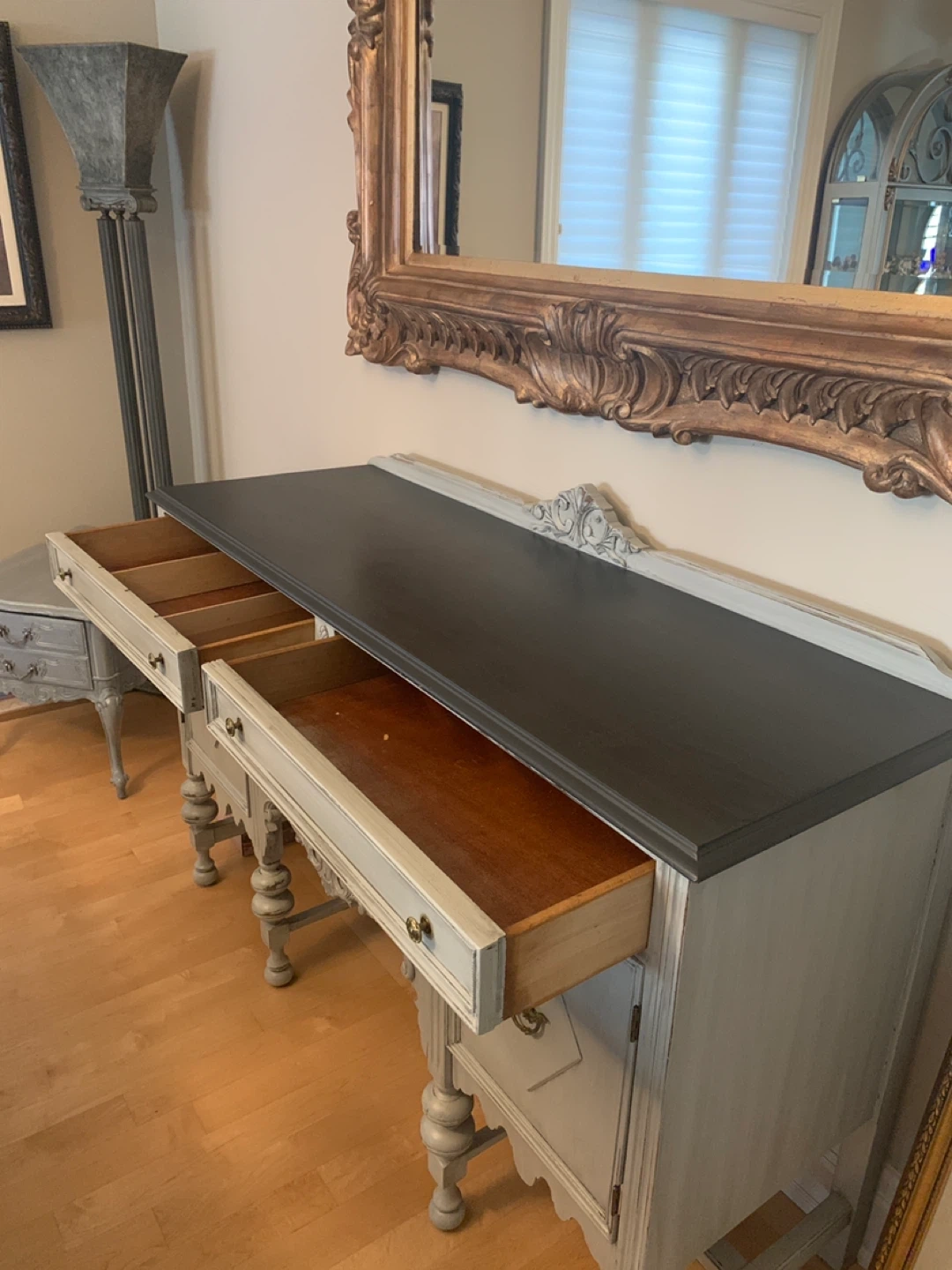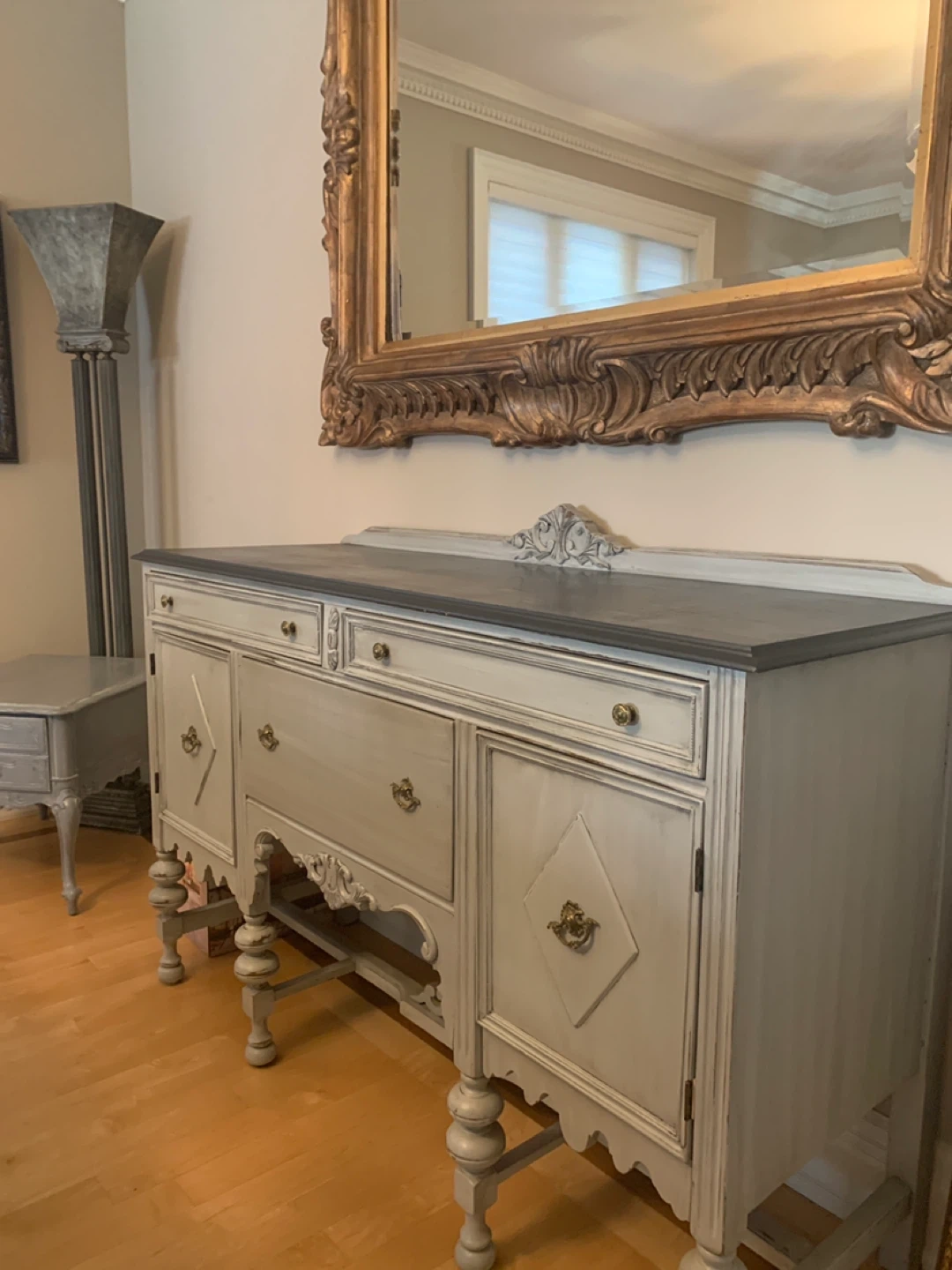 Selling a charming vintage buffet sideboard! It features a lovely grey painted finish and has plenty of storage with drawers and cabinets. Perfect for adding a touch of classic elegance to your dining room or living space