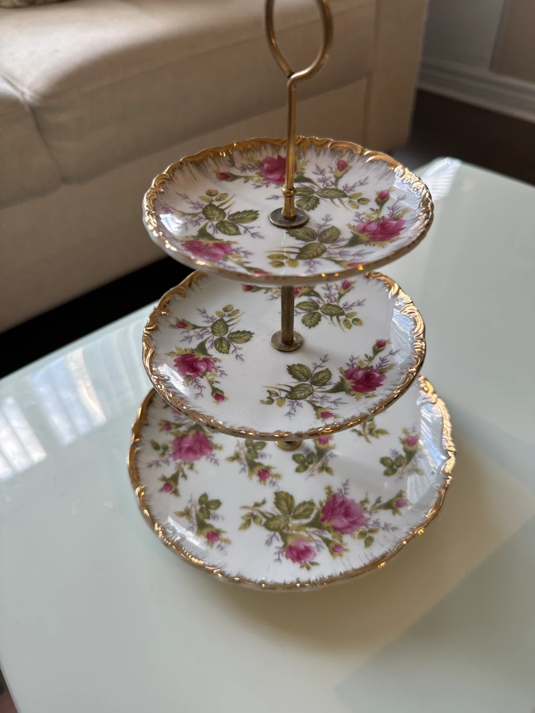 17Selling a lovely vintage GTC Fine China three-tiered serving stand! It features a delicate floral pattern with pink roses and gold trim. Perfect for displaying desserts or appetizers at your next gathering
