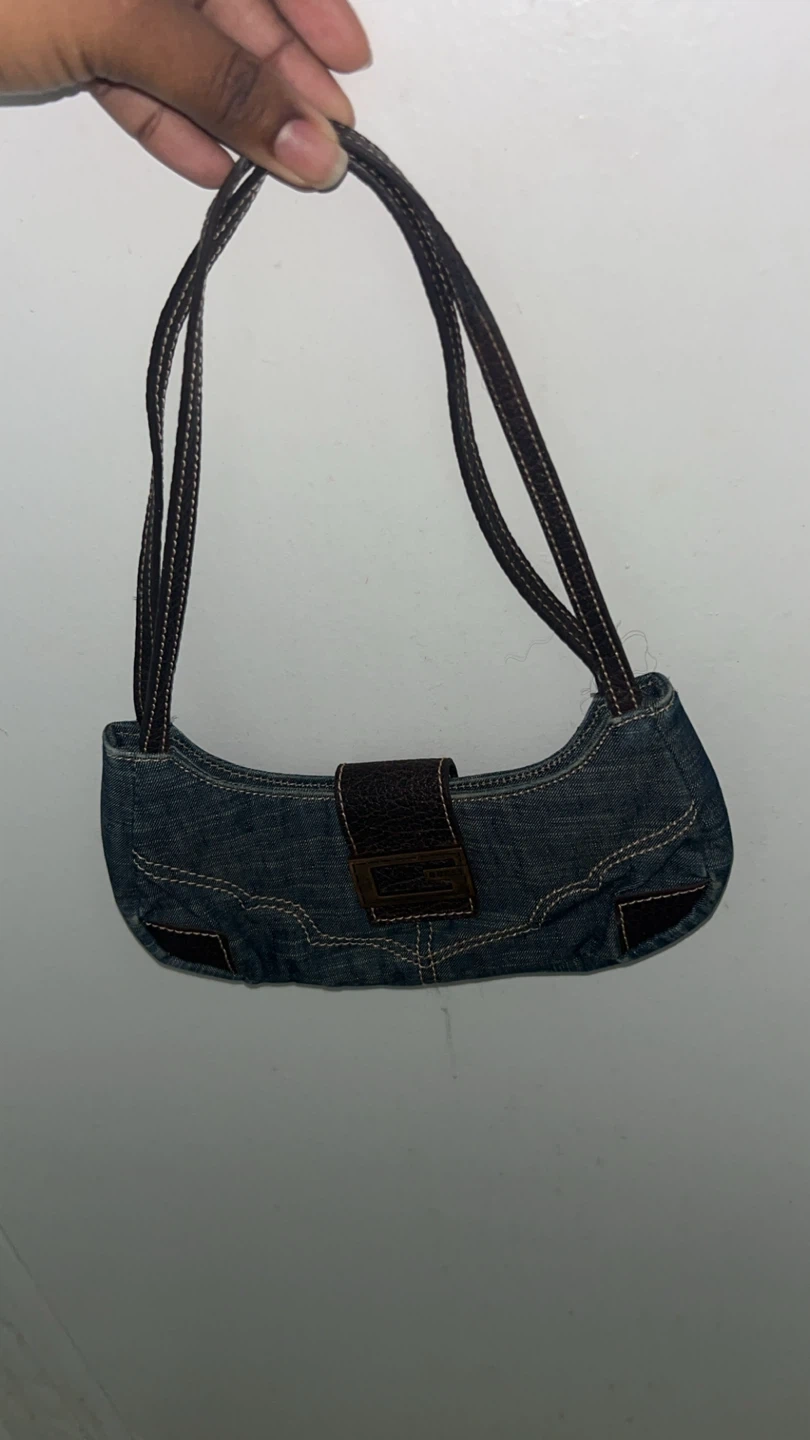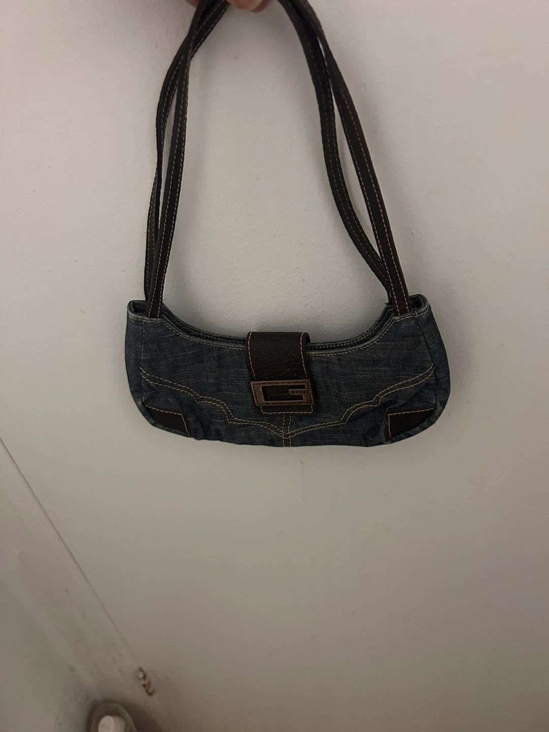 Cute Guess denim shoulder bag! It's in great condition and perfect for adding a touch of Y2K style to any outfit. The bag features a dark brown strap and buckle detail. It's just the right size for your essentials