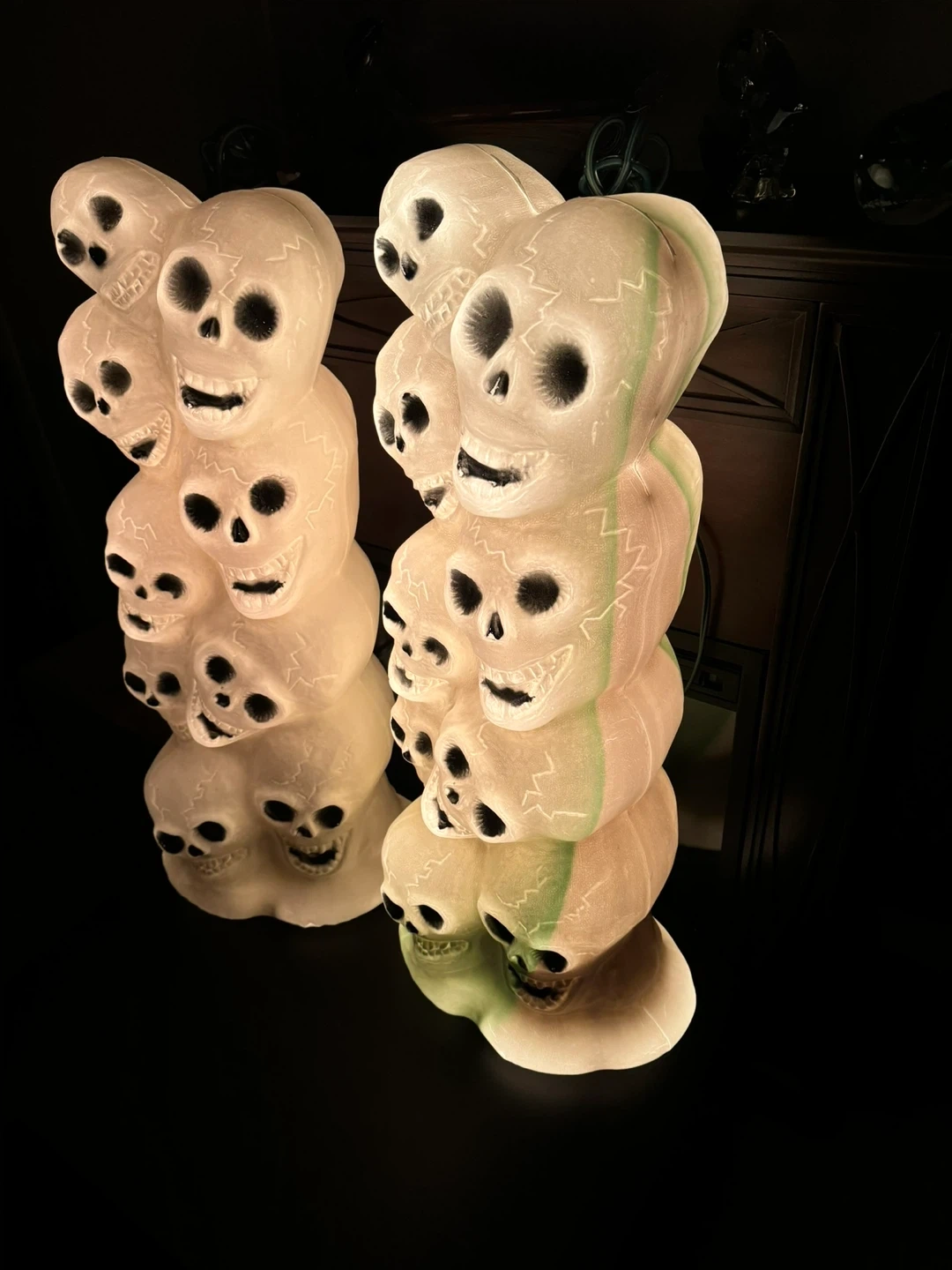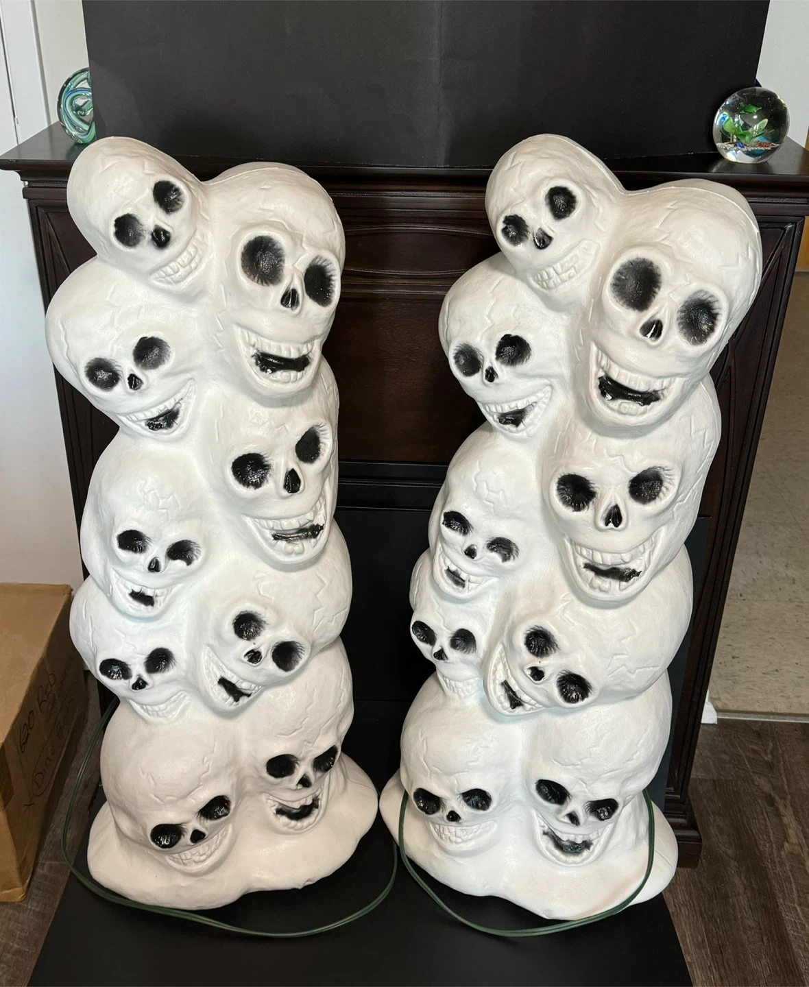 Pre Owned Vintage Skull Heads Blow Molds. 1990's *If ad is up it’s still available unless otherwise stated * Each one stands 31" tall Working lights. Good condition with 1 - 2 minor dents in the bottom of each. See Photos Both stand on their own just fine. No cracks. *Please Note* The one blow mold does have a green colour on the inside. See Photos Pricing: $120 Blow mold *A* (non green colour inside) $70 Blow Mold *B* (W/ green colour inside) If both are purchased together a discount may be applied at seller's discretion. * Meet Up In My Area Only * Newmarket All Sales Final No Returns No Refunds