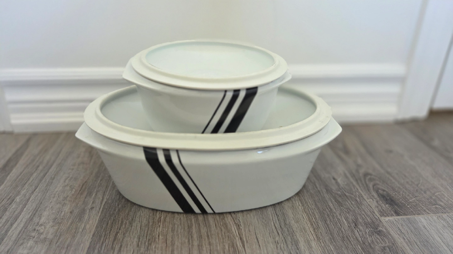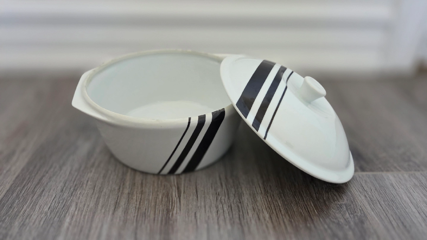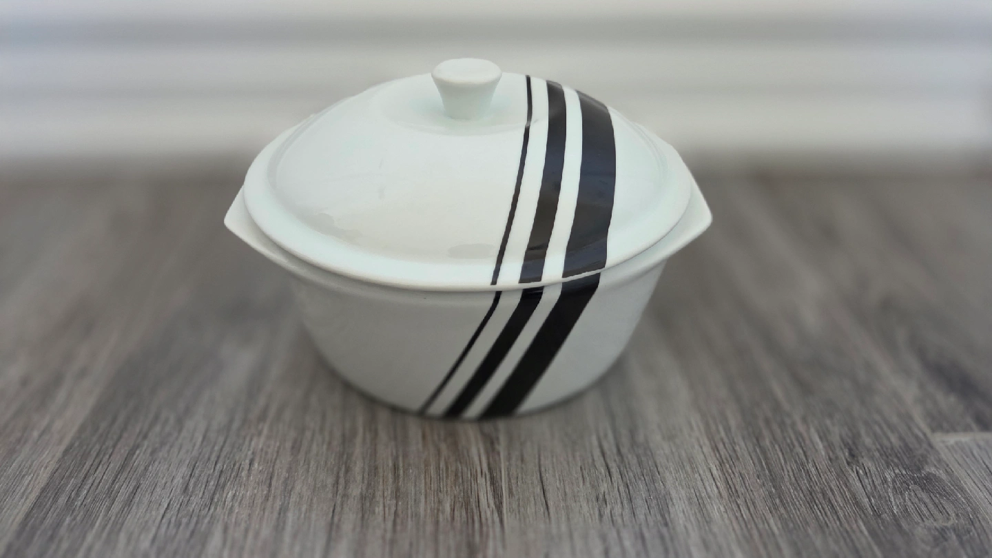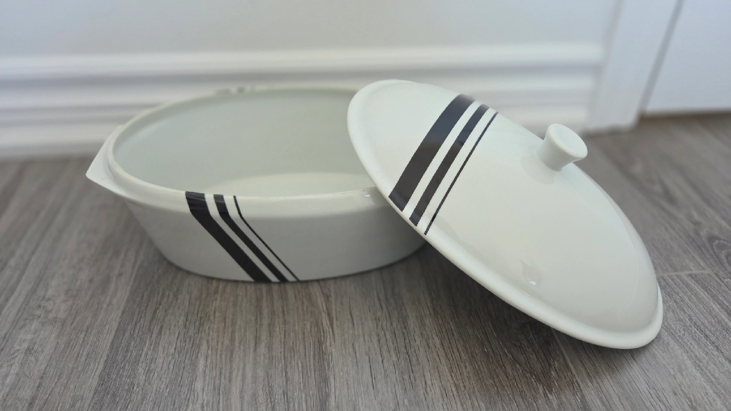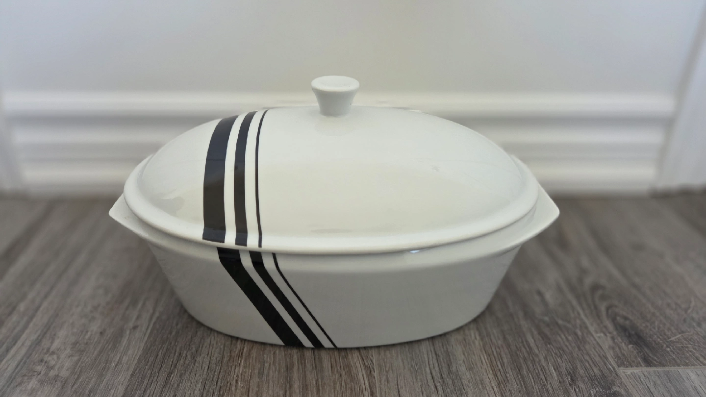 10Selling a vintage Hall's Superior Kitchenware oval casserole dish! It's white with black stripes and includes a lid. Perfect for baking or serving your favourite dishes