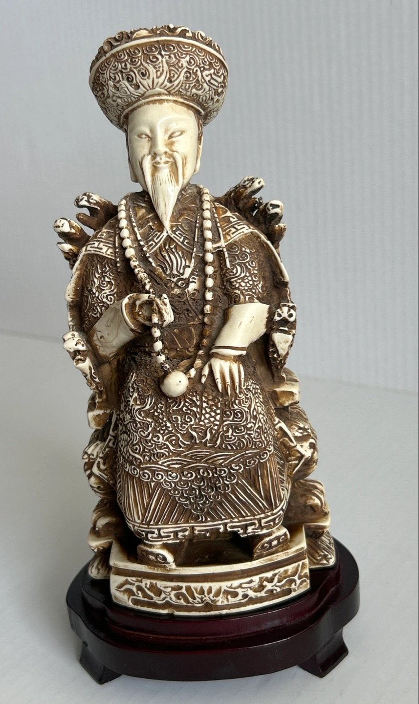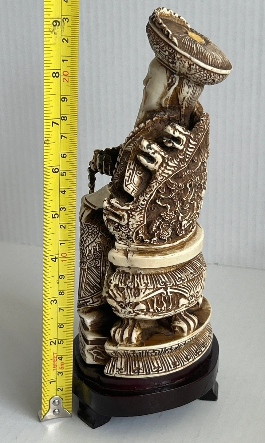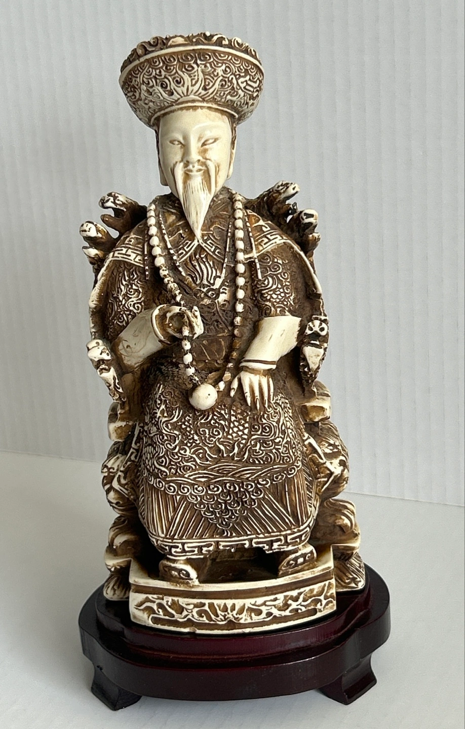 Intricately Hand- Carved Resin Figurine. Features a seated Chinese Emperor in ornate clothing. Detailed craftsmanship. Excellent quality and in very good condition. Rests on its original dark wooden base. Unique collectible piece. Check out all the photos for more details. Smoke/Pet free home. Cash and Pick Up only please.