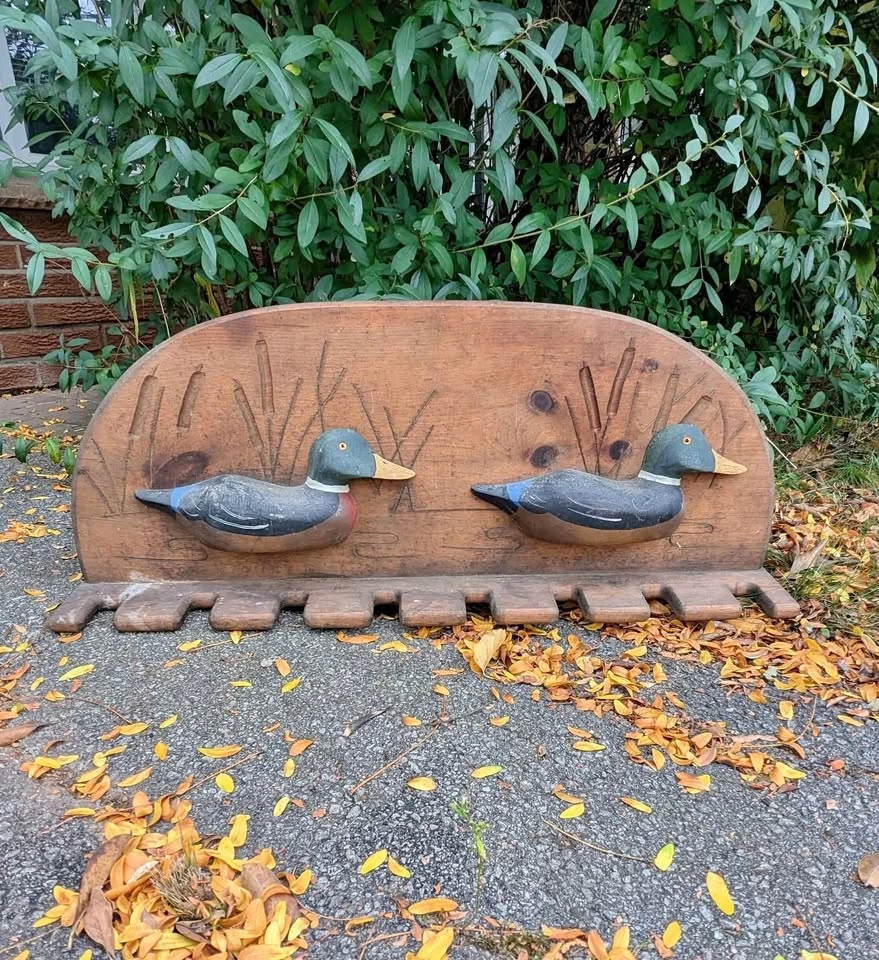 Charming vintage hand-carved wood wall rack featuring two mallard ducks in 3D relief with cattail detailing. Made from solid wood with natural patina, this piece blends hand-painted folk art charm with rustic lodge style. Originally designed as a key or coat rack, it has a notched lower edge for hanging items and a groove along the back for easy wall mounting. Perfect for entryways, cabins, cottages, or vintage country homes. Era: c. 1960s–1970s Solid carved wood, hand-painted Size: Approx. 22" wide × 9" tall Good vintage condition; some surface wear and light scuffs consistent with age - should freshen up nicely will some light cleaning.