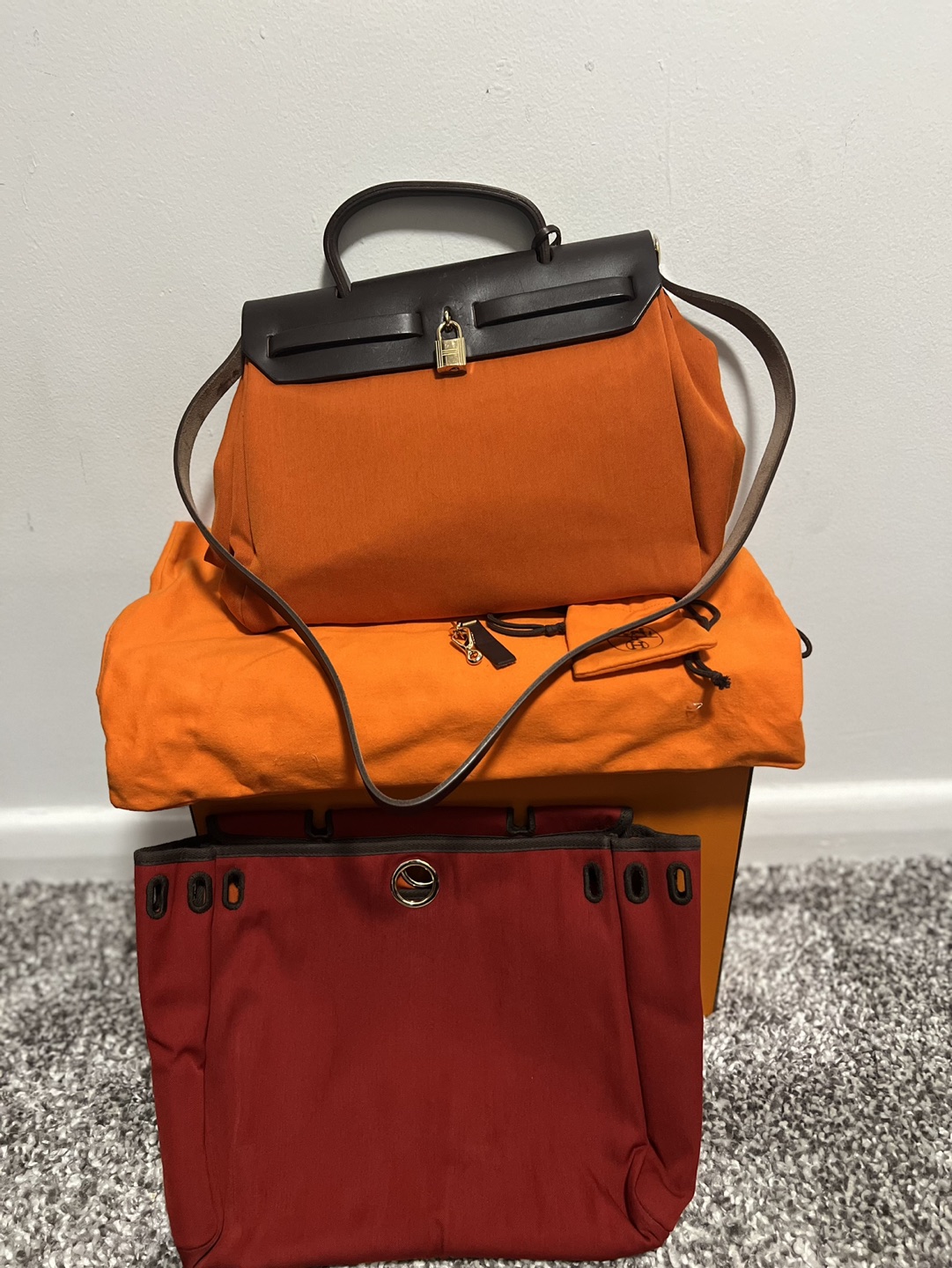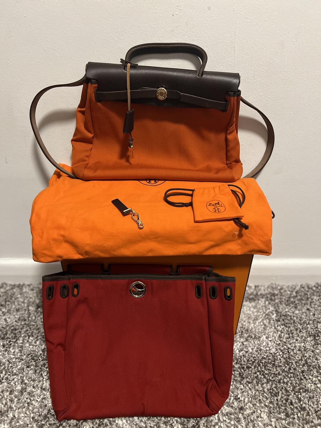 Selling my vintage herbag. Changeable bag either orange or red bag. With lock and key and original box. Box had some tapes.