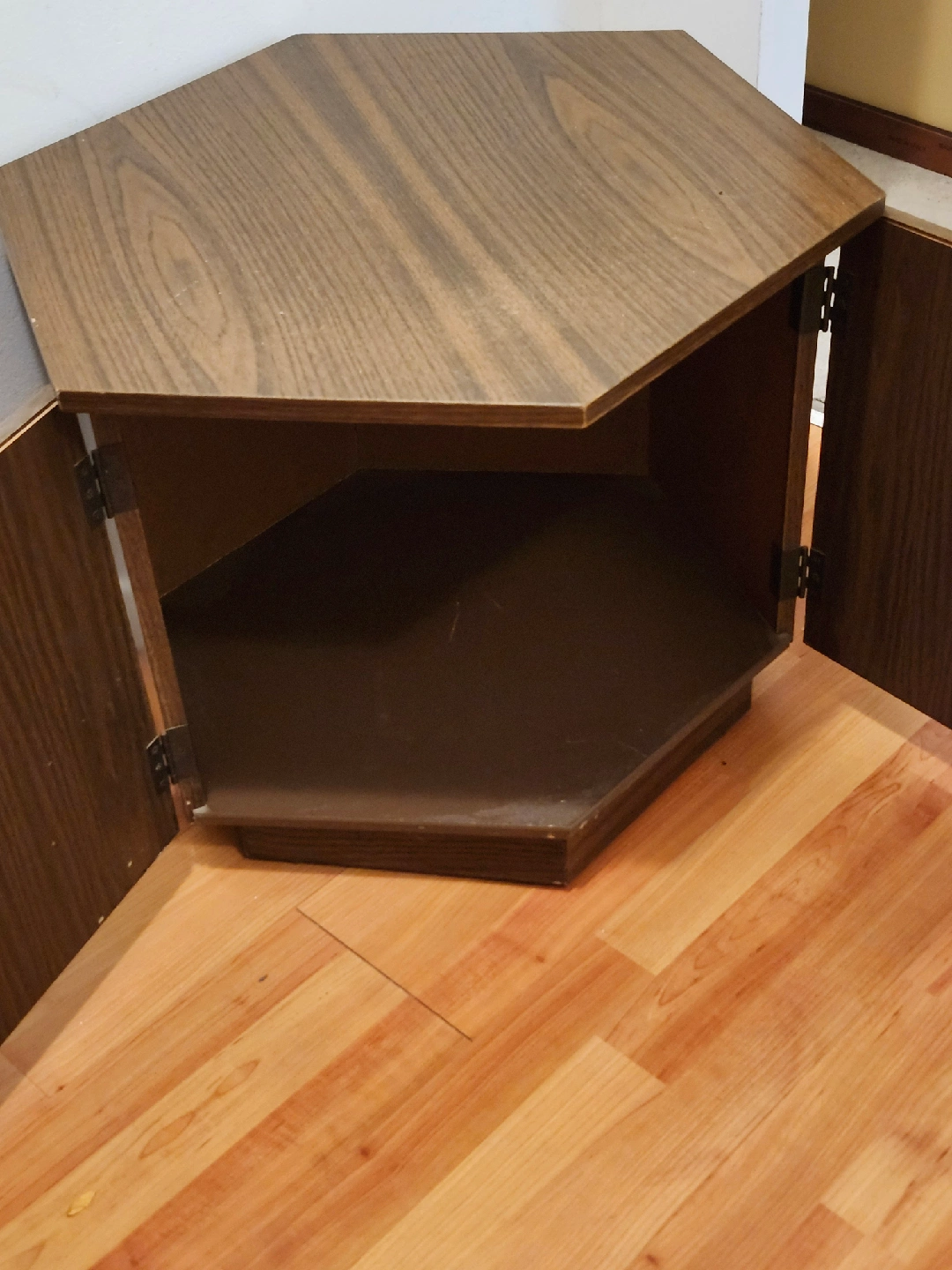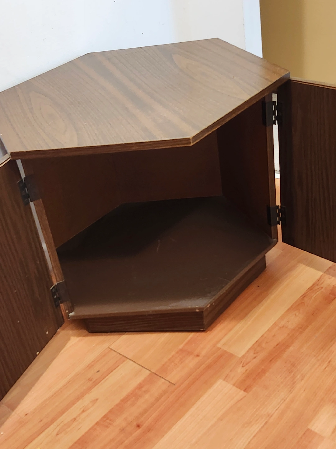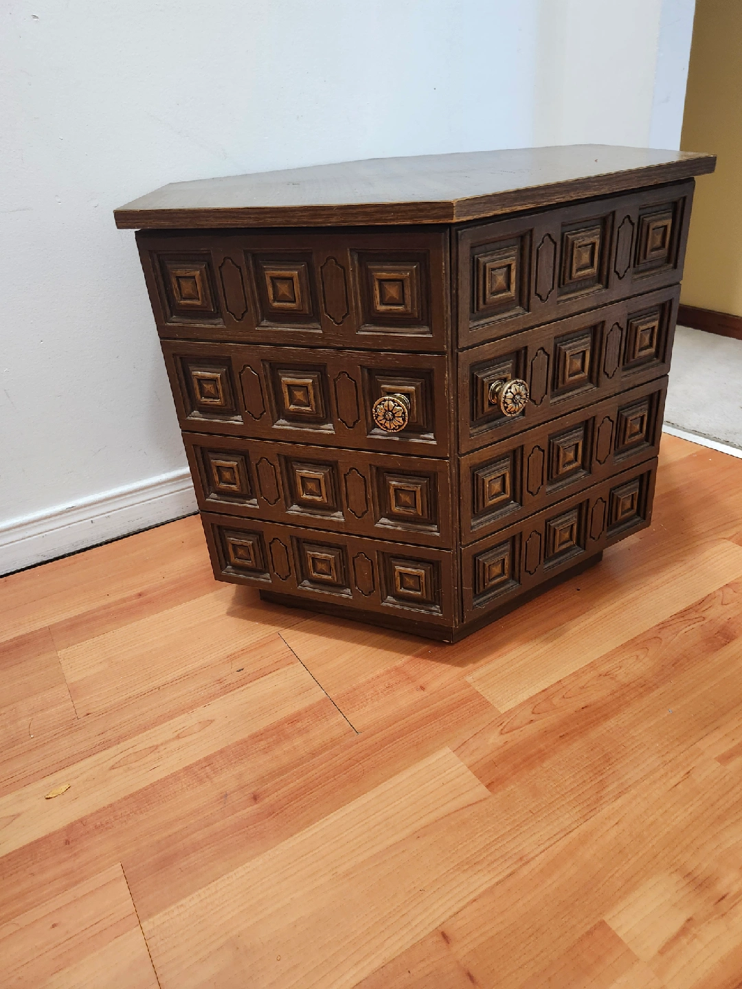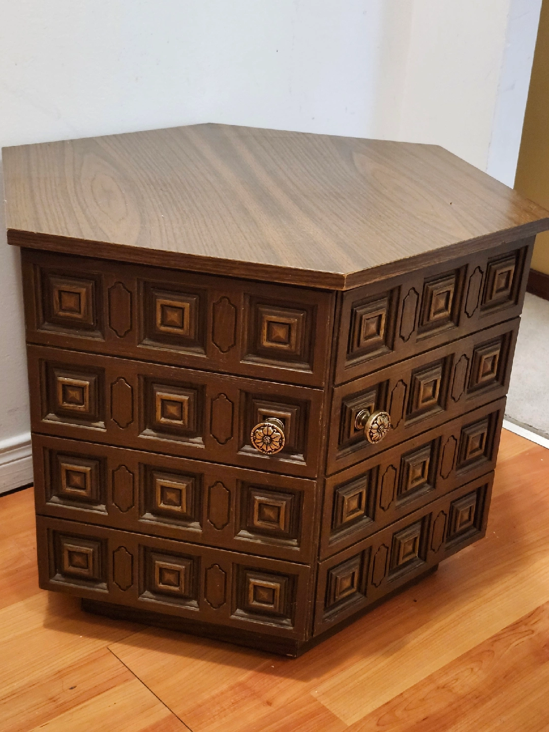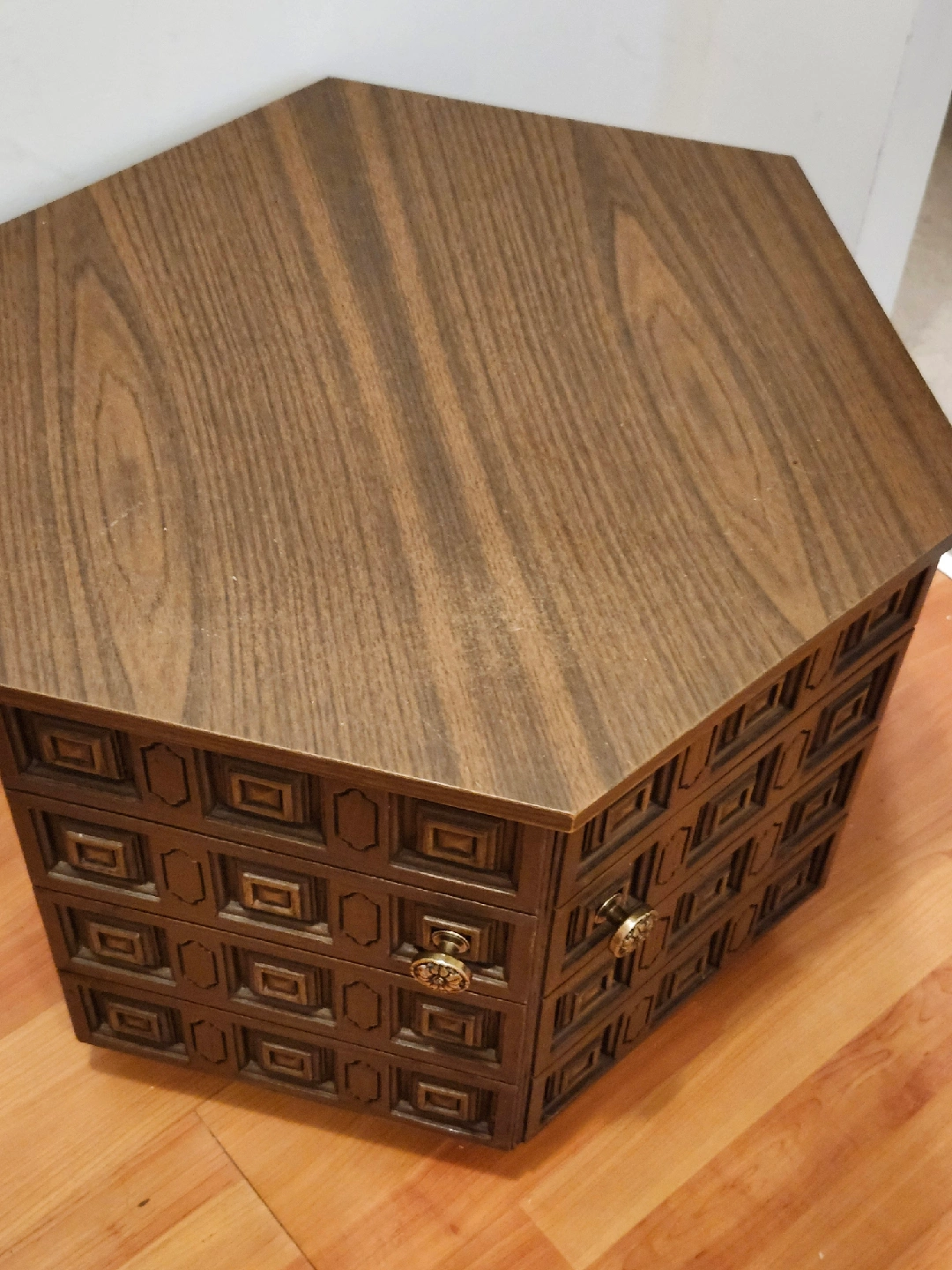 Selling a unique vintage hexagonal side table that could also work as a nightstand. It has a lovely dark wood finish and decorative details. It's in good condition and ready for a new home!