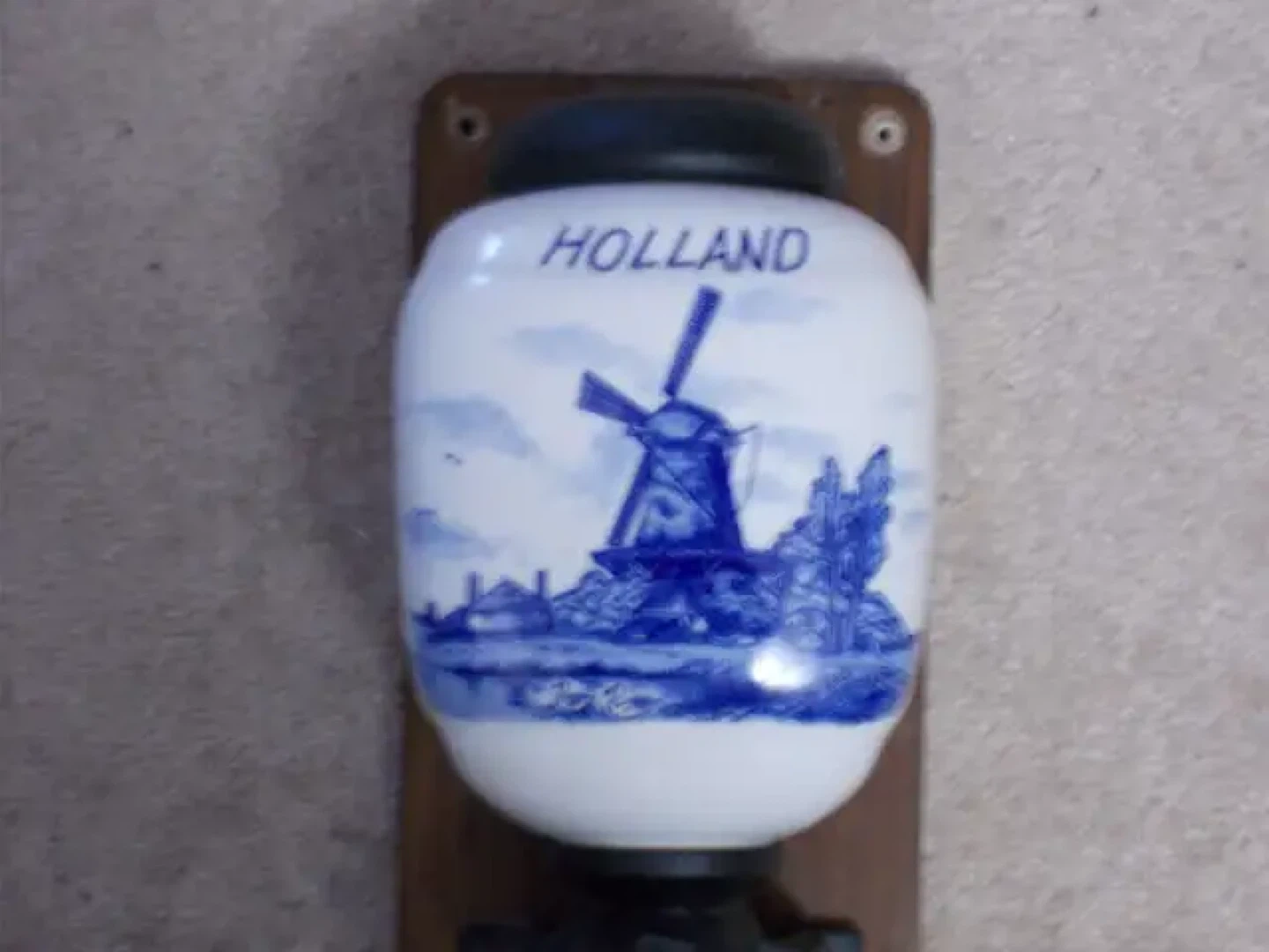 Selling a charming vintage coffee grinder with a classic Delft Blue design! It features a beautiful white ceramic body adorned with traditional blue Holland motifs like windmills and tulips. The grinder is mounted on a wooden frame with a metal grinding mechanism. A lovely piece for coffee enthusiasts or collectors of Delftware Excellent condition Ready for display Wood backing: 12 inches long x 5 inches wide Hand painted Missing catch glass