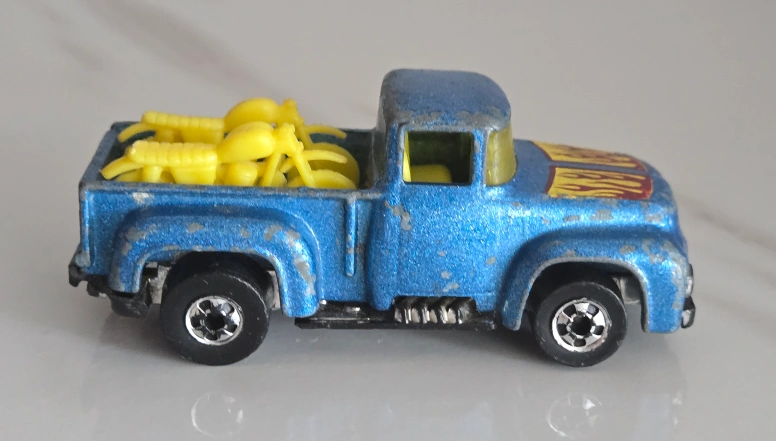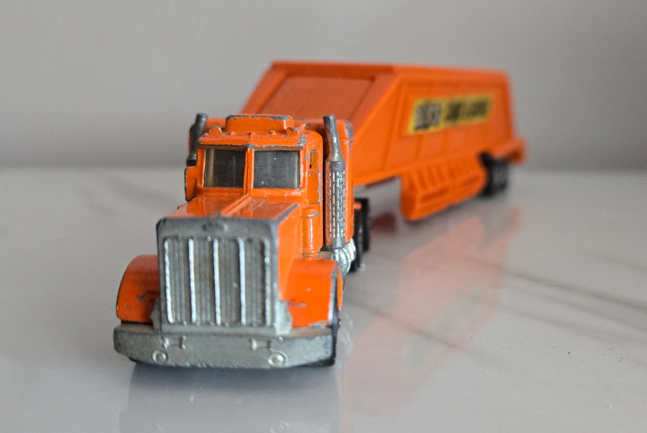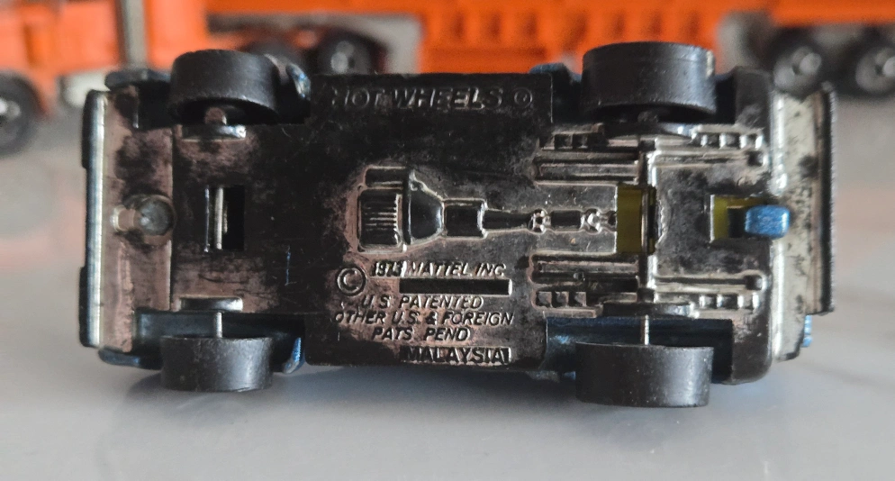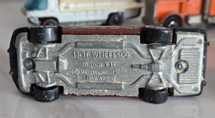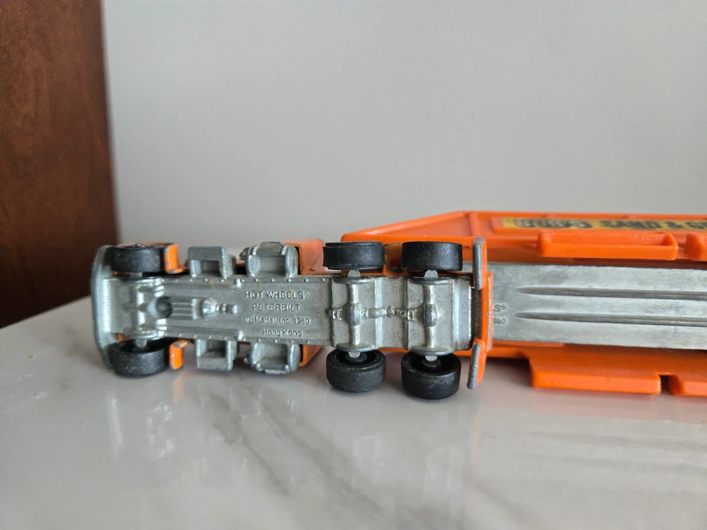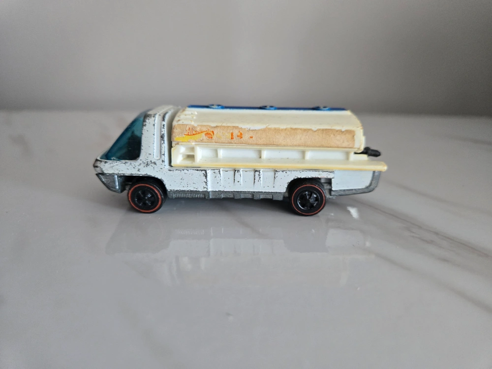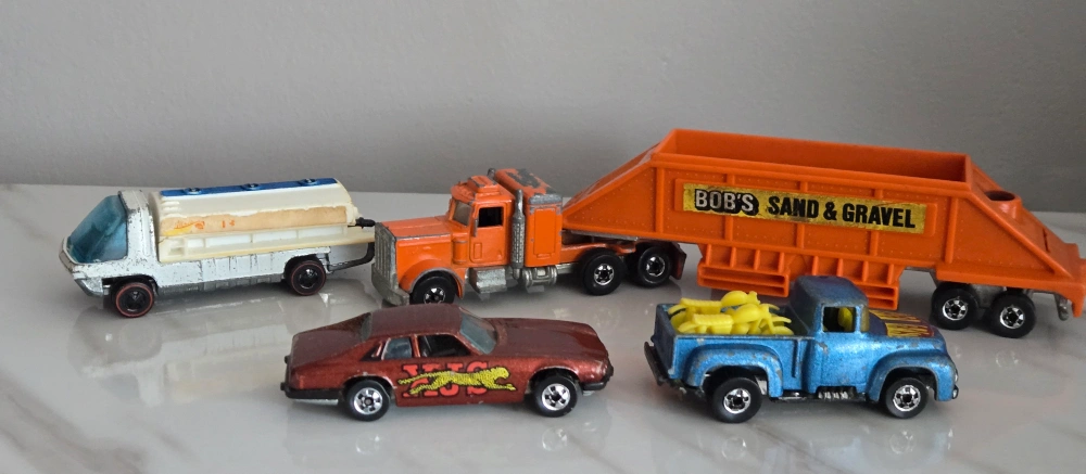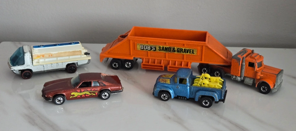Selling 4 Rare vintage Hot Wheels diecast. Includes 1969 Heavyweights Redline Fuel Tanker #6018. Orange Peterbilt semi-truck with Bob's Sand & Gravel trailer, a brown 1977 Jaguar XJS, and a 1973 blue Hihauler 56 pickup truck with yellow Motorcycles. These are in used condition, showing some signs of wear from play, but still have lots