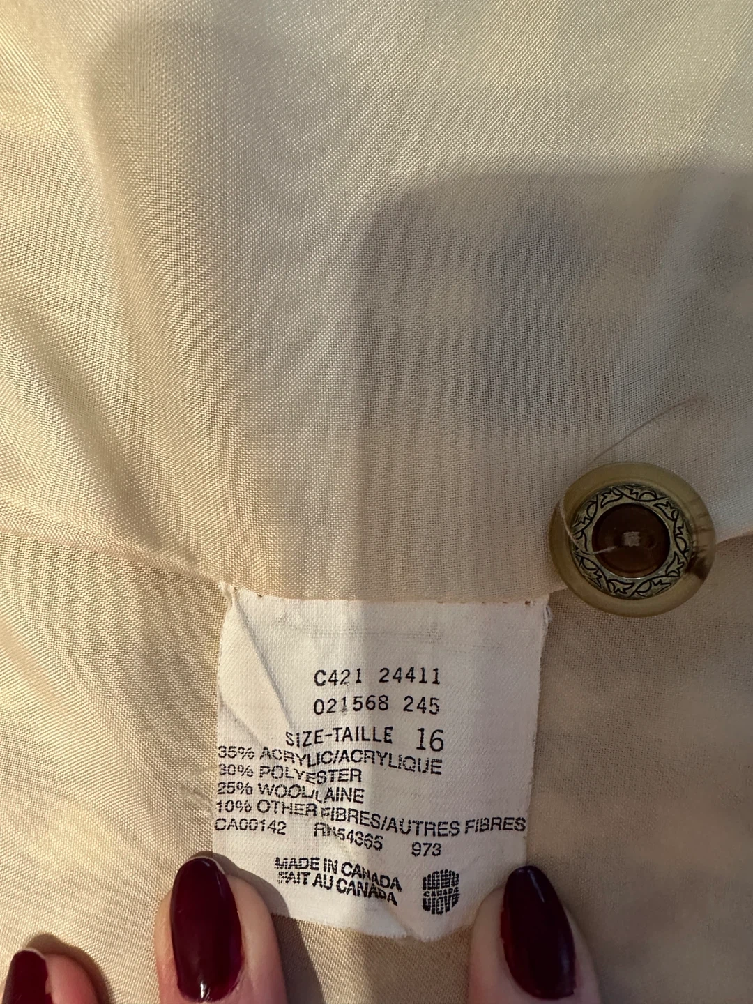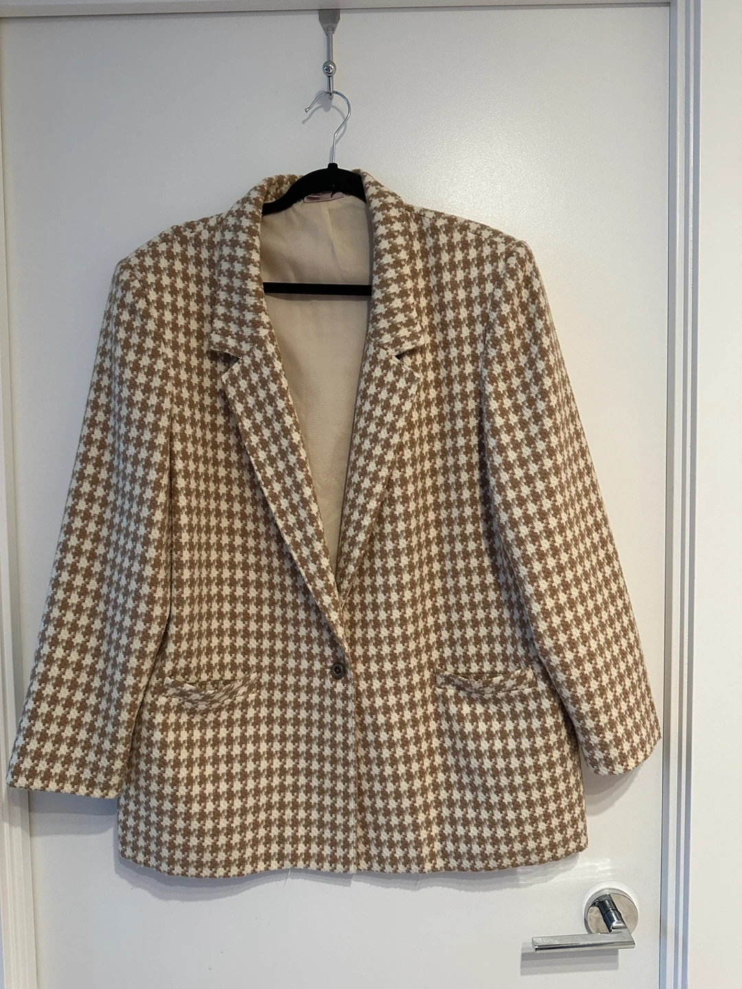 Selling a stylish houndstooth blazer in size 16. The material composition is 35% acrylic, 30% polyester, 25% wool, and 10% other fibers. This blazer is perfect for adding a touch of sophistication to any outfit!