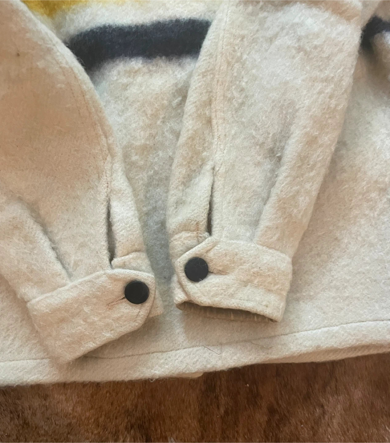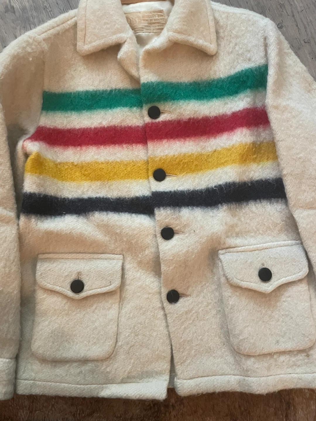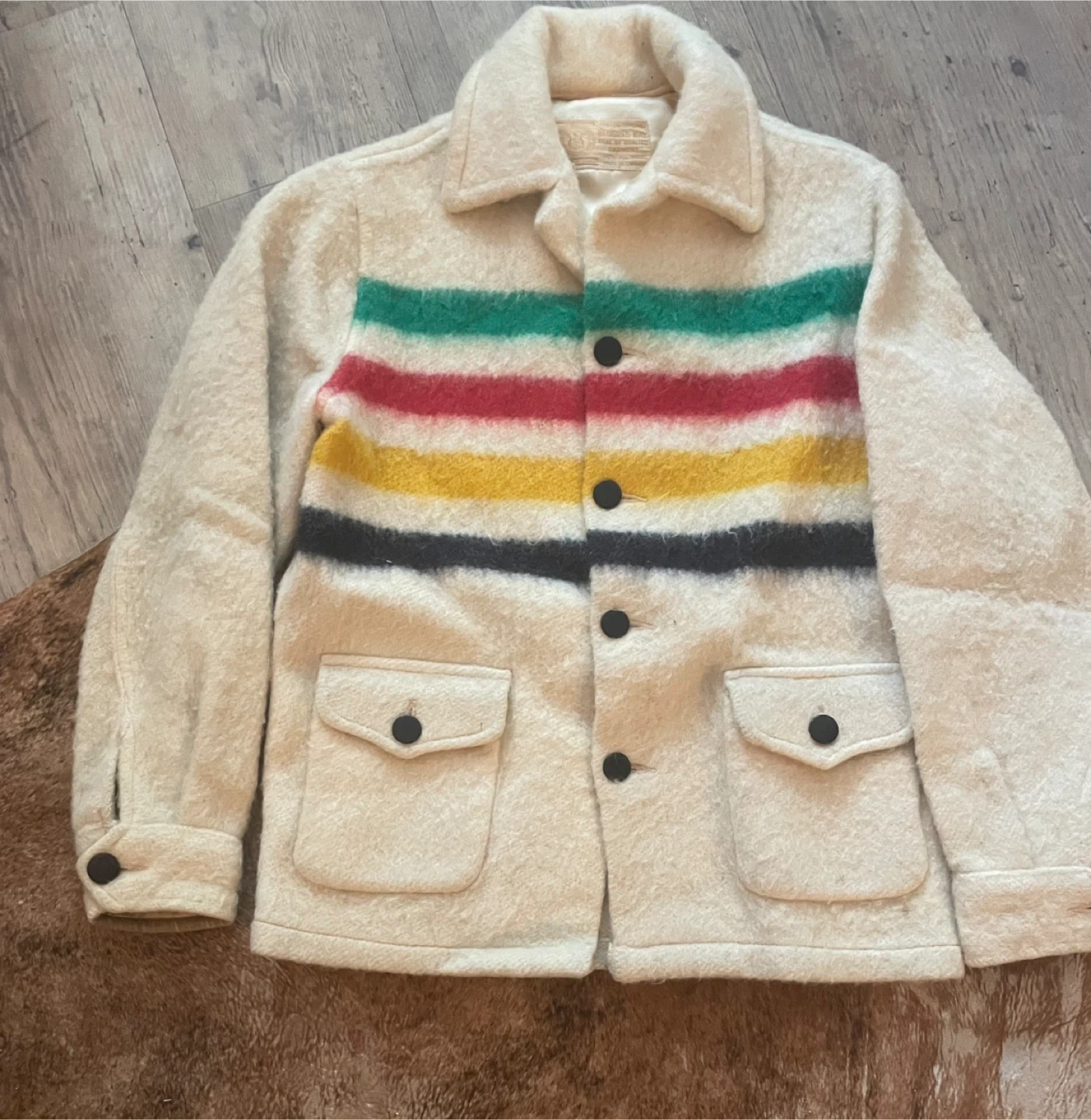 Located in Osborne Village with easy access to driveway for pickup . Selling a rare children’s sized vintage Hudson Bay Blanket Jacket from the 1960’s . I know because it was mine ! It is in excellent vintage condition with no holes or tears . Original buttons . Could use a day at the dry cleaners to freshen it up . Not sure what size it is . Measures 17.5” or 45cm across the front 19” or 48cm from collar to bottom 20” or 51cm from shoulder to cuff. Made with 100% wool in Canada . I would say it would fit a five year old to 10 year old depending on their size . . Accepting etransfer to guarantee hold . Cash FCFS . I do have a square reader as well for credit cards if required at pickup . Shipping is available at buyers expense. Please see my other listings as I downsize . Thanks