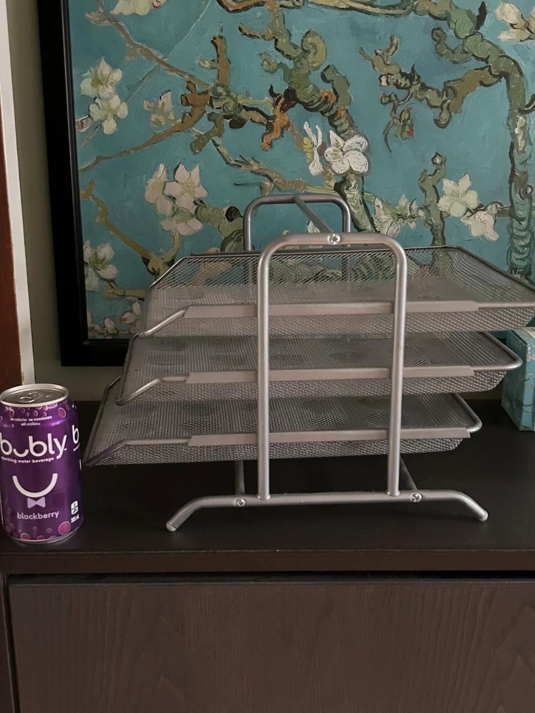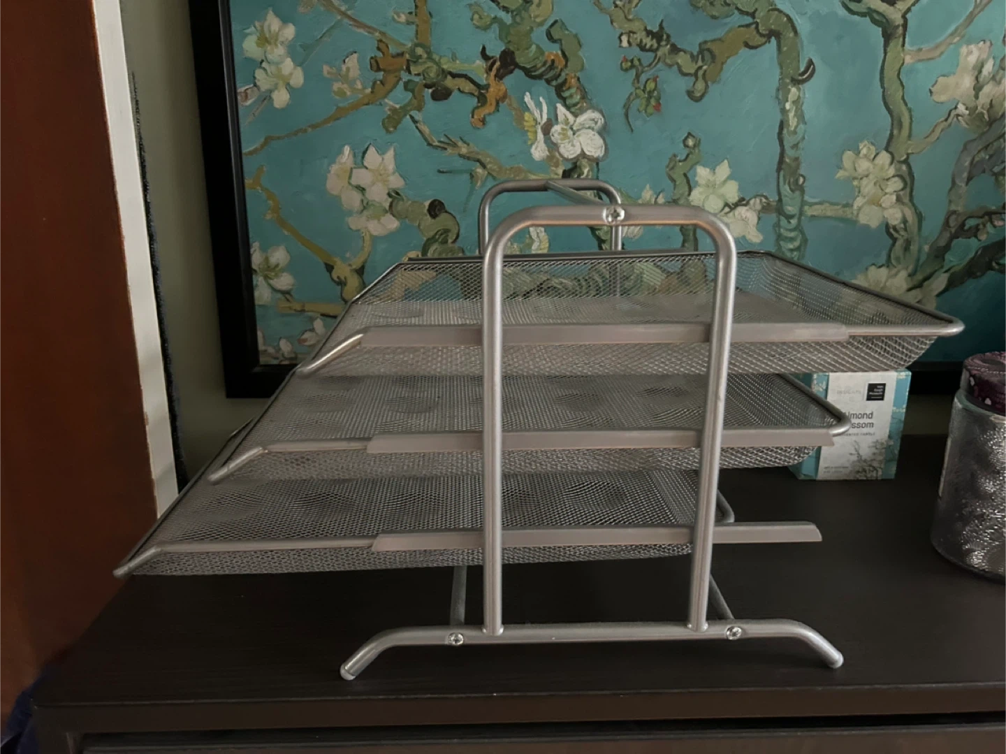 1000+Vintage IKEA 'Document' 3 Tiered Paper Tray Dokument desk office organizer sleek 1999 Vintage IKEA 'Document' Tiered Paper Tray - Nickel Silver Finish, Minimalist Office Decor, Modern Desk Organizer, Flat Mesh Storage Rack 12.00 Good to very good used condition Very Slight wobble A simple rectangular metal tray with 3 layers that can slide outward. Holds 8.5x11" standard US letter size paper and A4 paper Flexible re pickup Elmsdale Road M4J 3M3 Donlands O'Connor East York Don Mills south exit off DVP