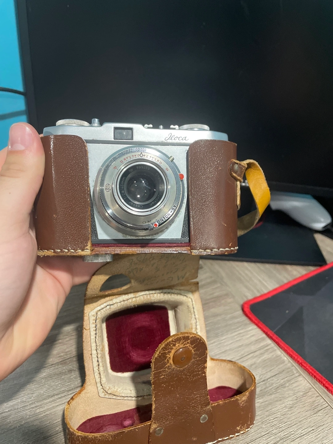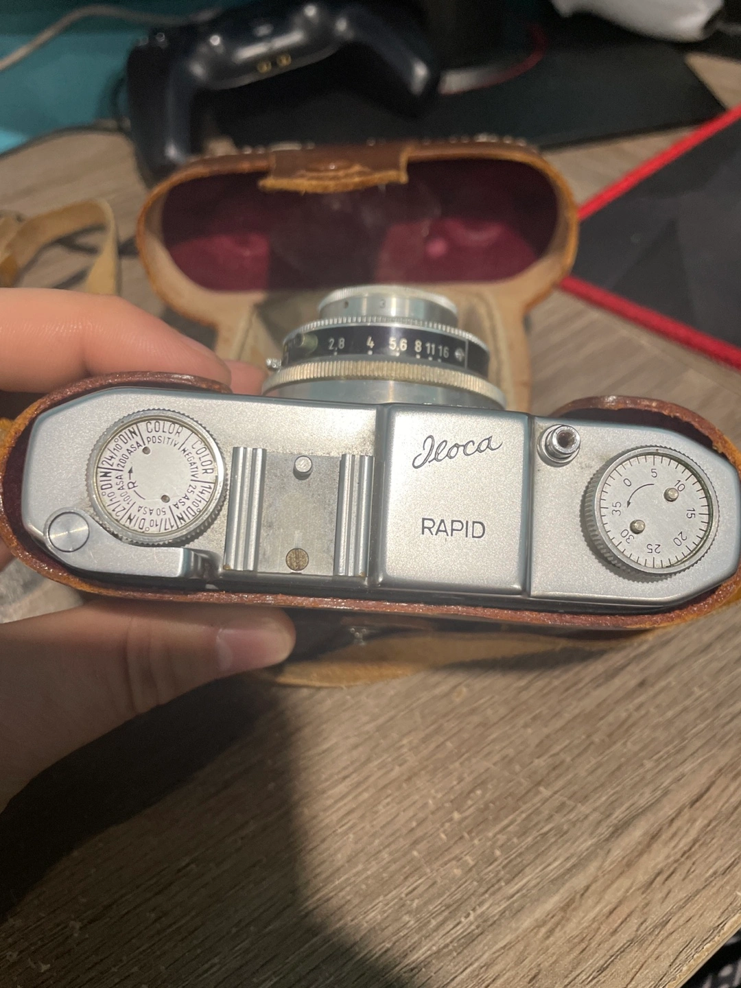 Selling a vintage Iloca Rapid camera. It comes with its original brown leather case. A cool piece for collectors or photography enthusiasts!