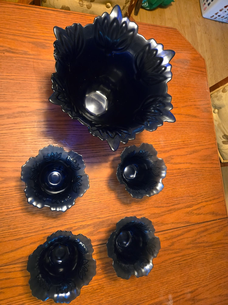 Selling a beautiful vintage Indiana Glass Harvest Grape bowl set. It includes one large bowl and four smaller bowls, all in a striking dark blue colour. Perfect for adding a touch of vintage charm to your home!