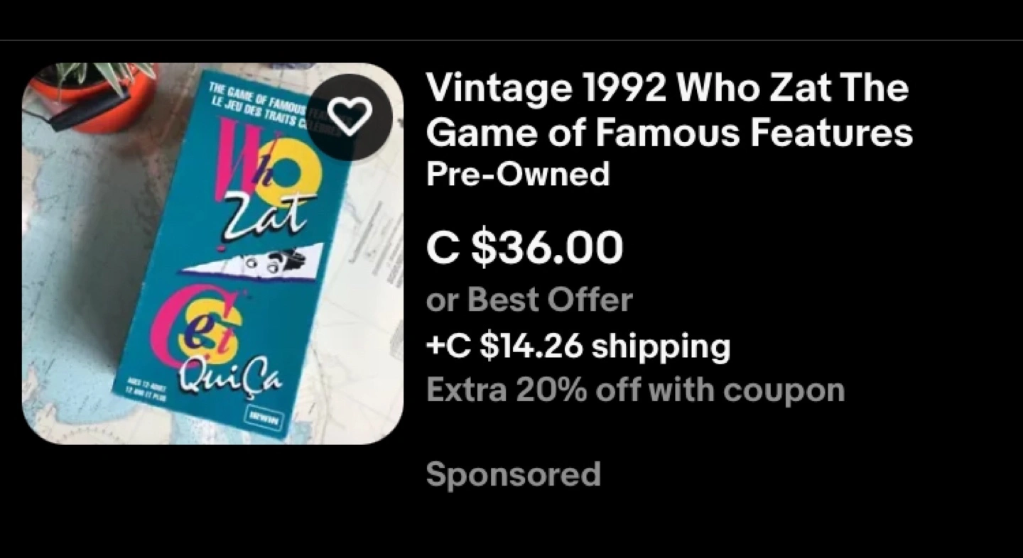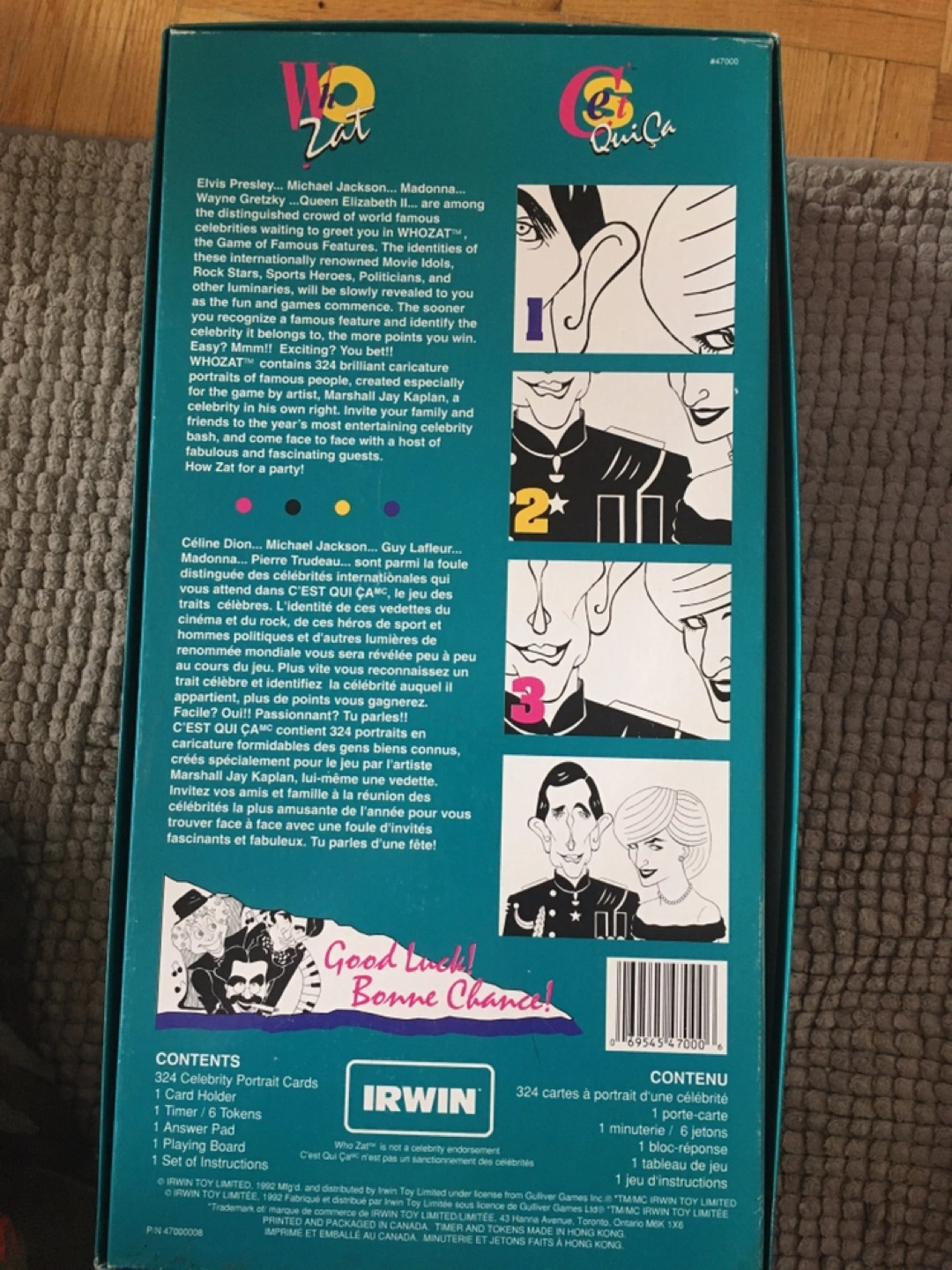232Selling a vintage 1992 edition of Who Zat, the Game of Famous Features! It includes 324 celebrity portrait cards, 1 card holder, 1 minute / 6 tokens, 1 answer card, 1 playing board, and instructions. Perfect for family game night or a fun party with friends. Ages 12 to adult it says. All pieces and in very good condition. Pick up and cash only pls ๐