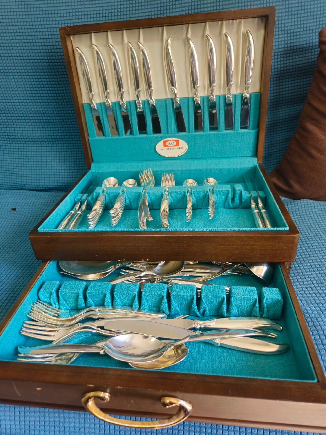 Selling a vintage IS 1847 Rogers Bros. flatware set. Flair pattern. It comes in a wooden storage box with a turquoise lining. A lovely set for any collector or for special occasions!