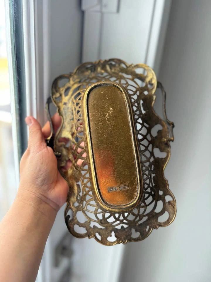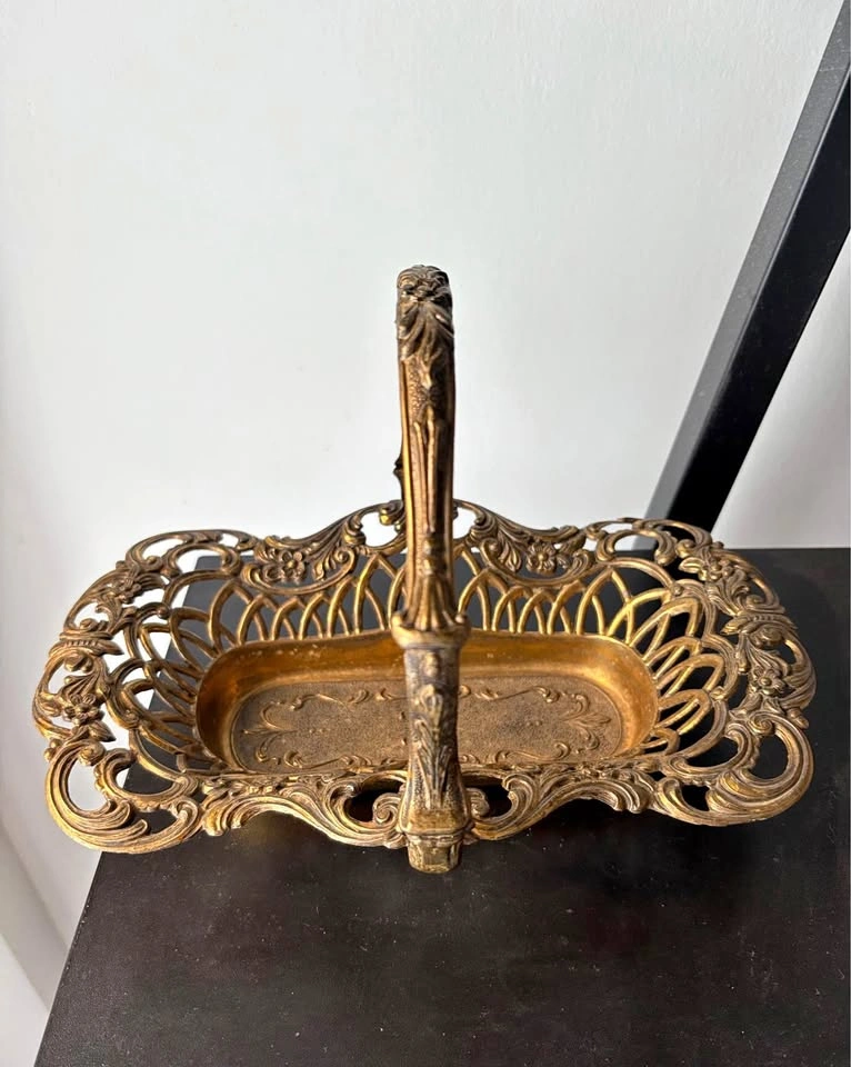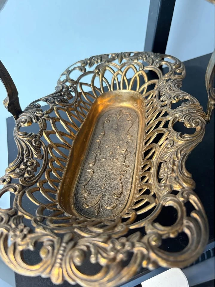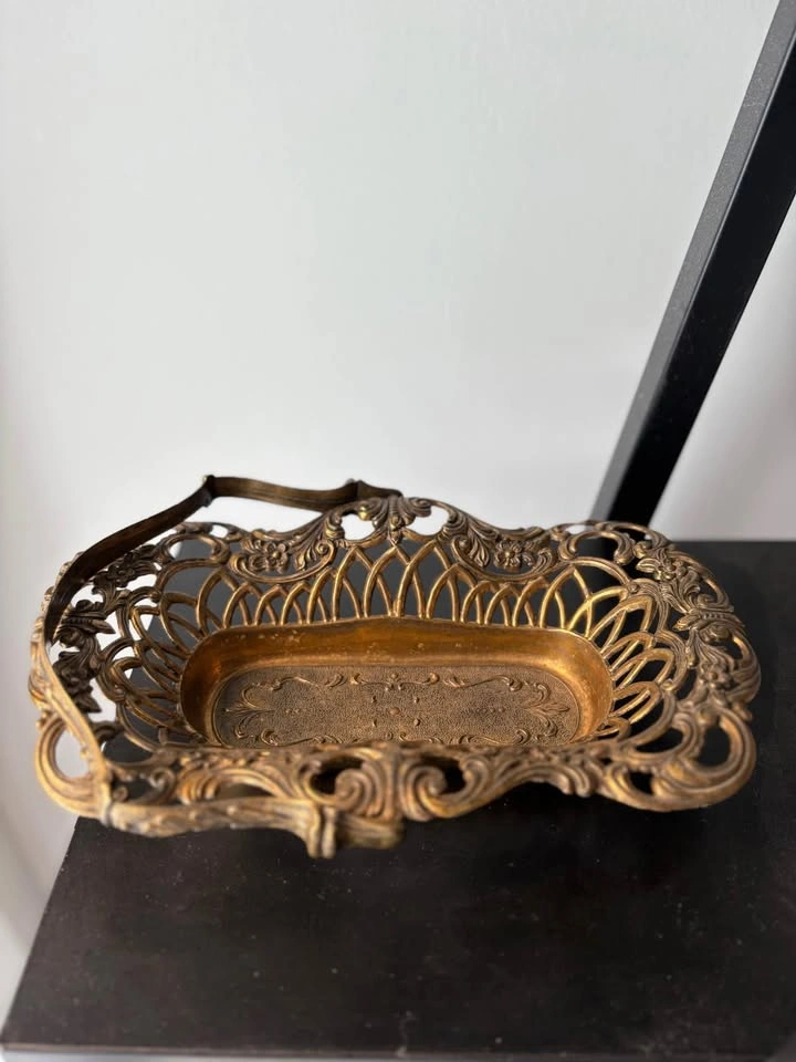 65This vintage ornate filigree brass basket was made in Italy and is still in beautiful condition despite its age. The basket measures approximately 9 inches long, 4 inches wide and 7 inches tall when the handle is raised. Good condition has wear and a few tarnished spots. No cracks or chips. See photos for details. Asking $50 or best offer. Pick up in Brighton! Check my other listings for bundles and deals 🙂