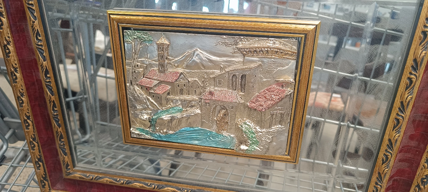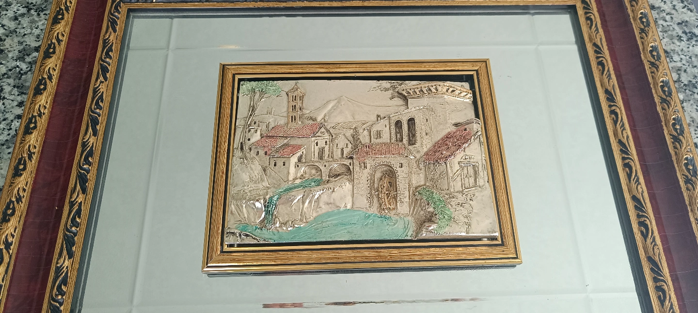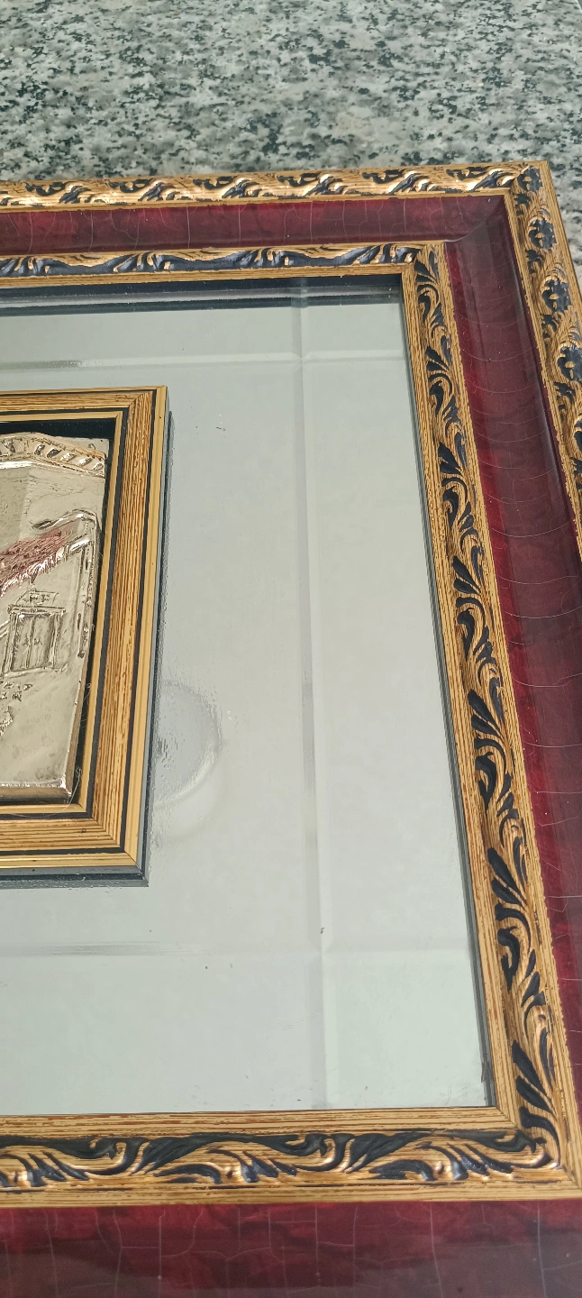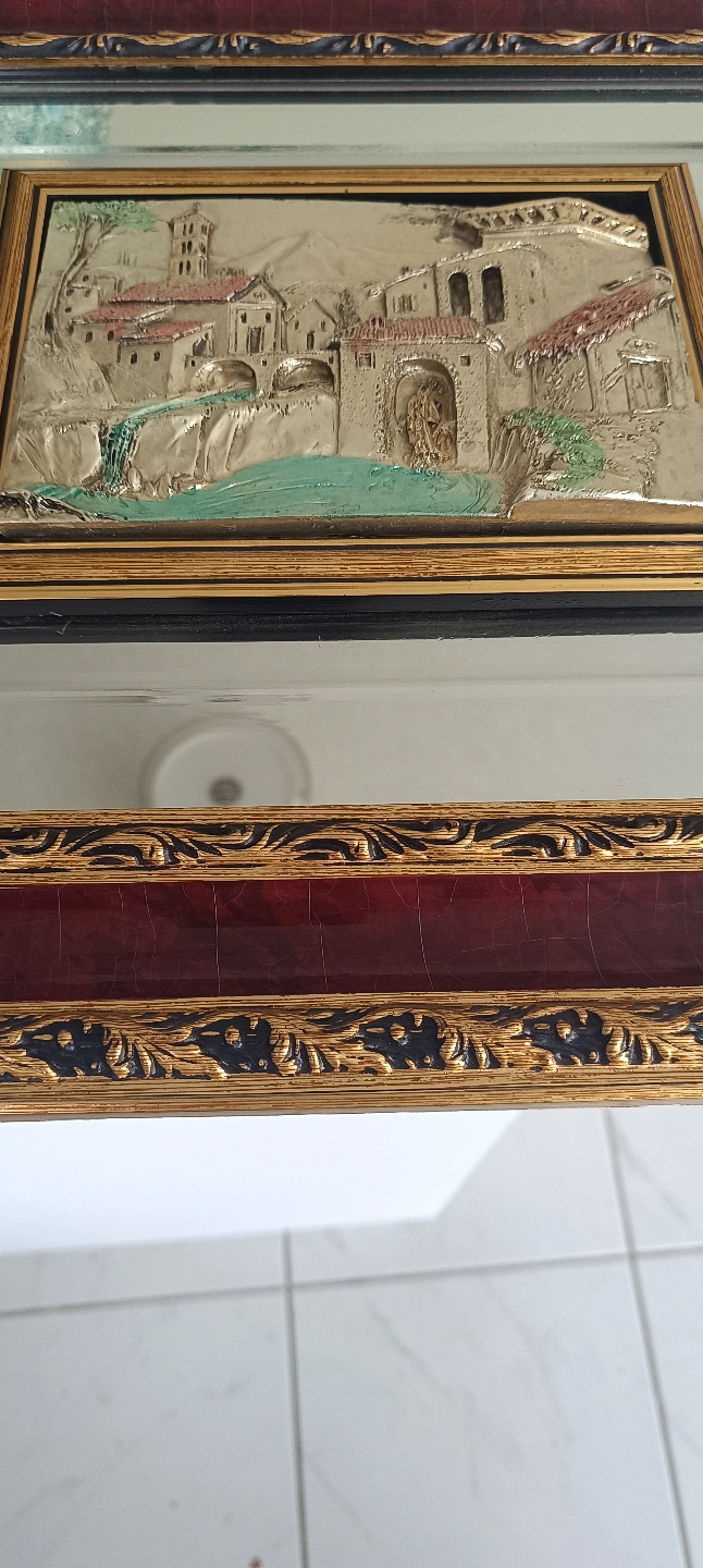 86Beautiful vintage framed relief plaque. Features an Italian landscape scene. Gold and burgundy frame. Mirror backing.