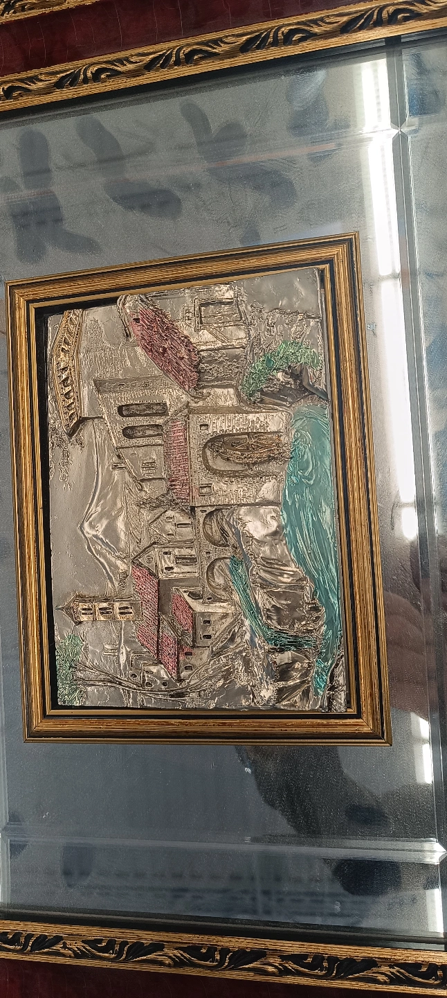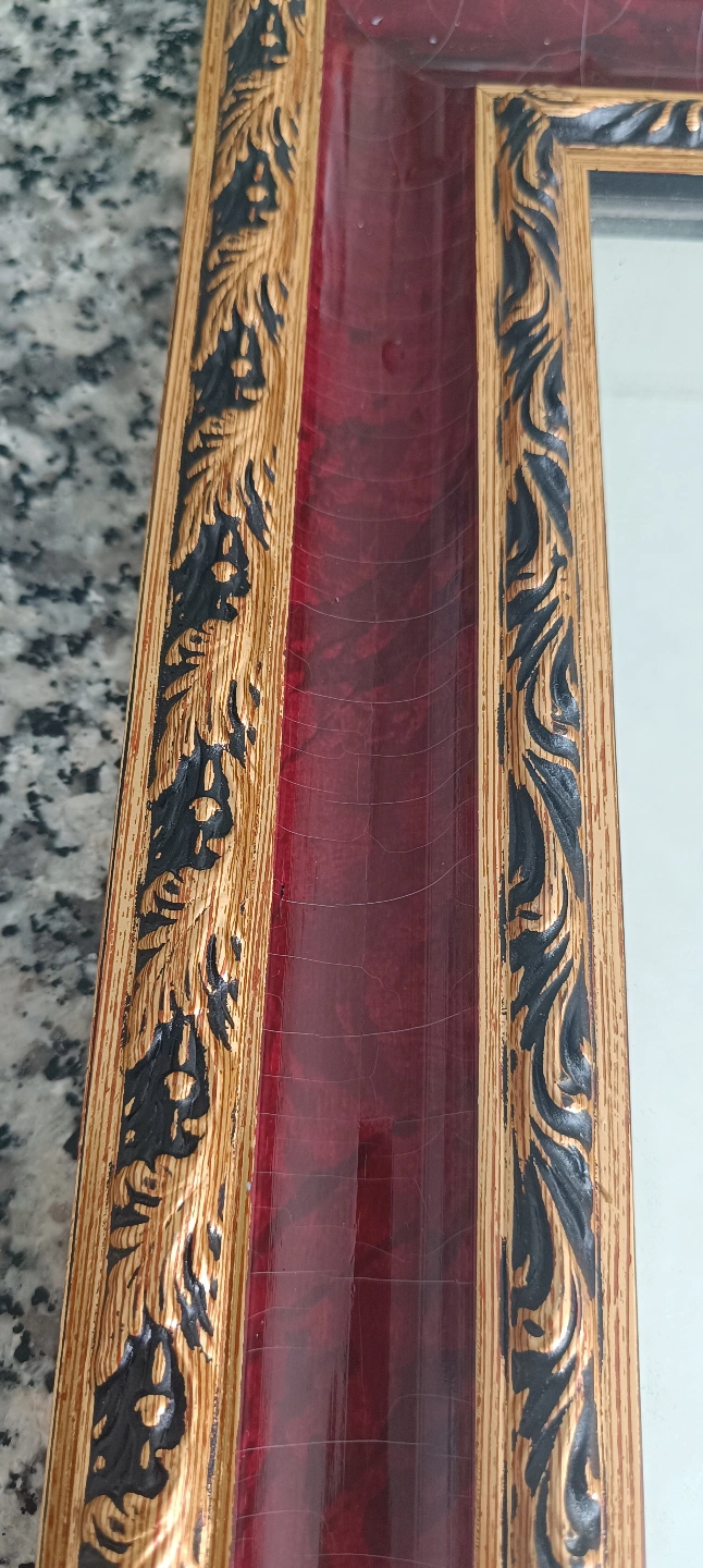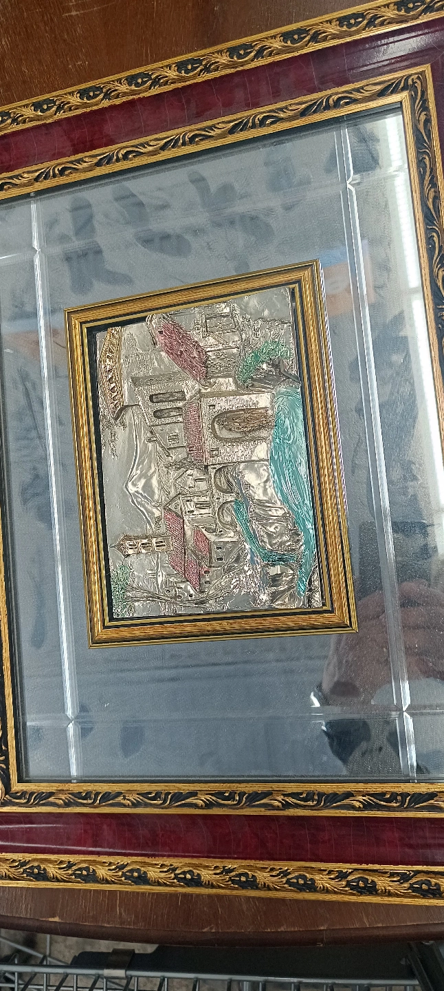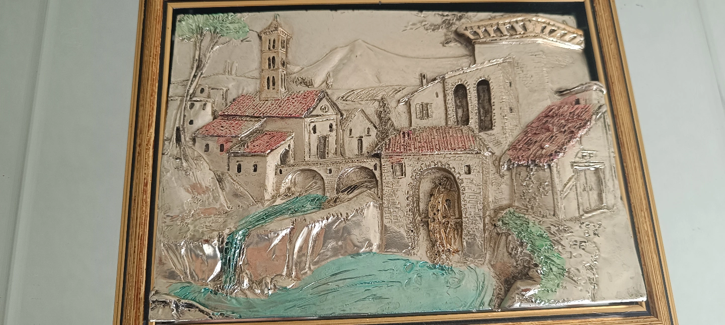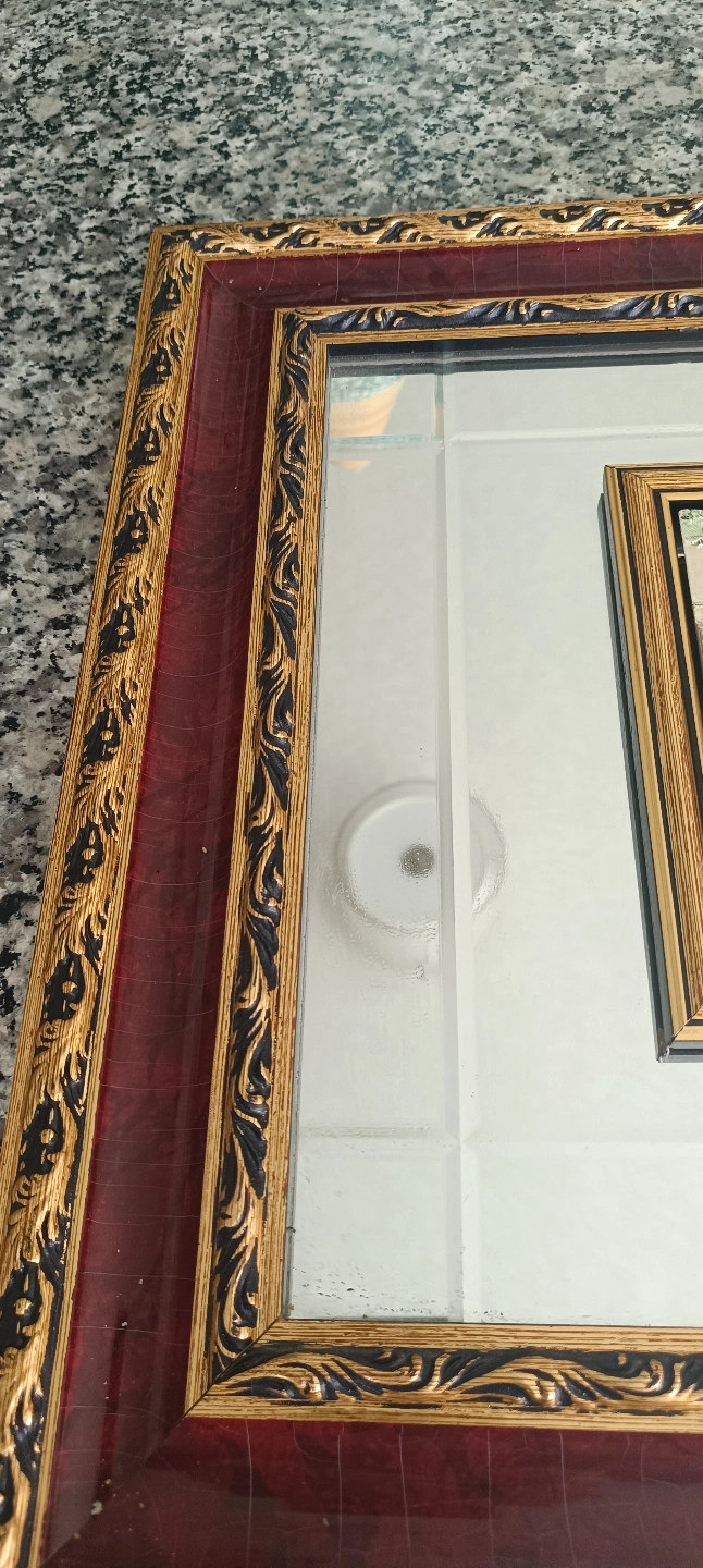 86Beautiful vintage framed relief plaque. Features an Italian landscape scene. Gold and burgundy frame. Mirror backing.