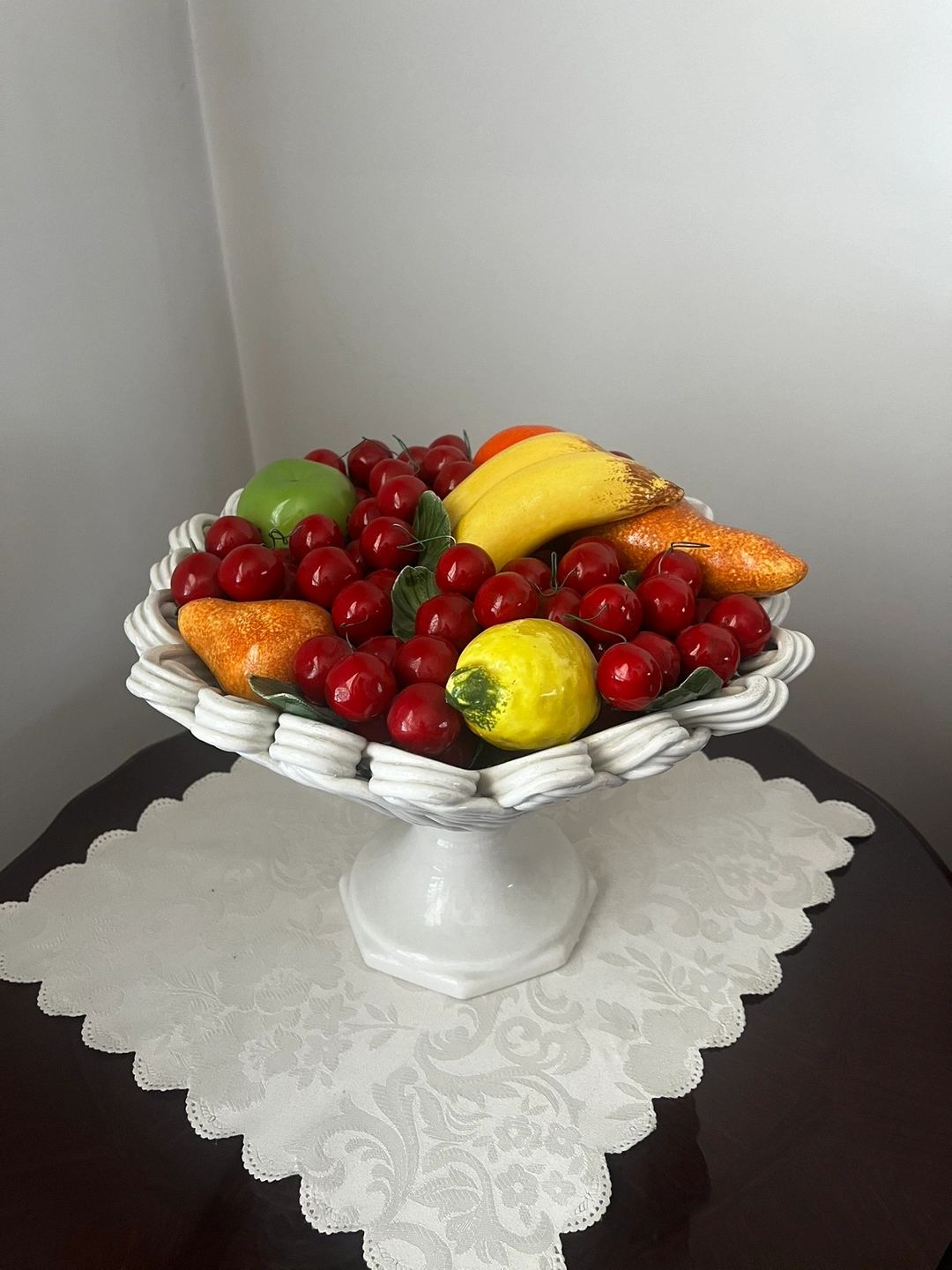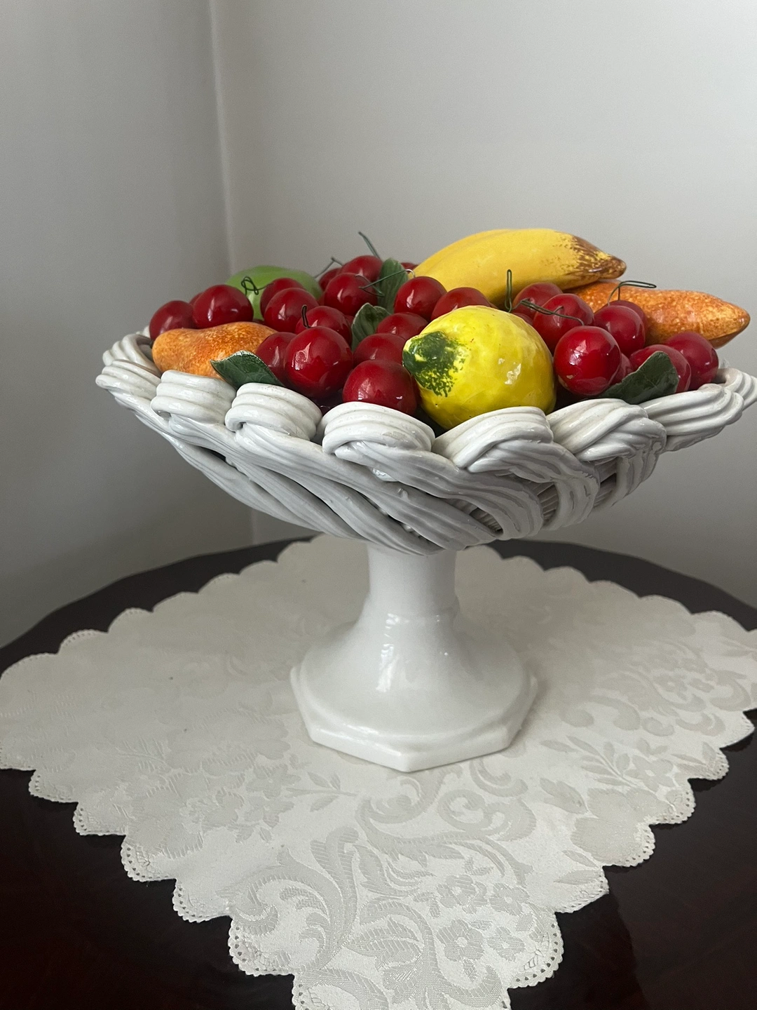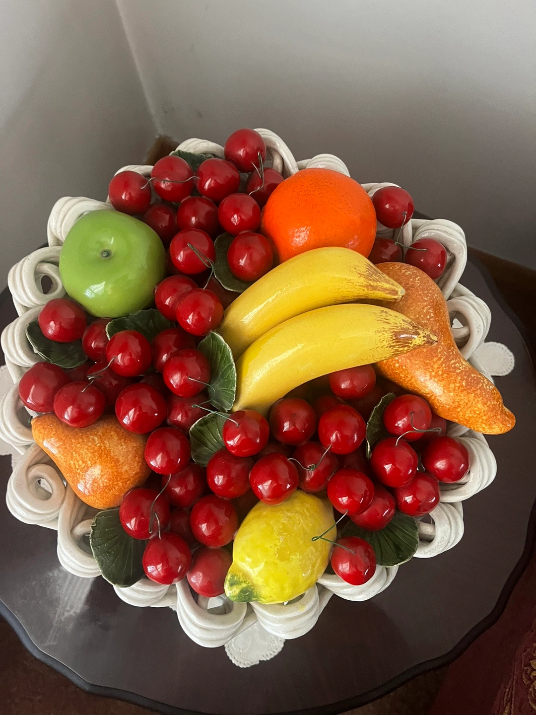 230Vintage Italian Pottery Large Fruit Basket. In great condition was used as a center piece on the kitchen table for years by my grandmother. Contains cherries, lemon, orange, pears, green apple, bananas. Selling for $50.00 or best offer.