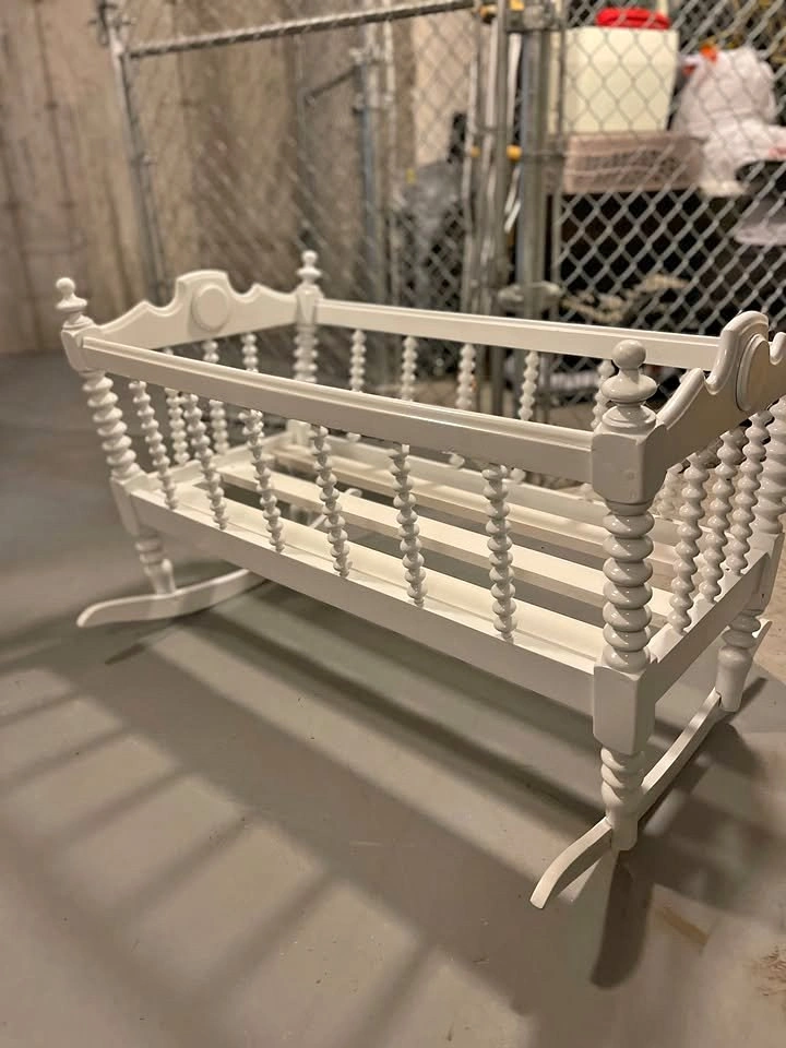 Refinished in gloss white. Measures 38"(L) x 20.5"(W) x 26"(H to top of spindle)