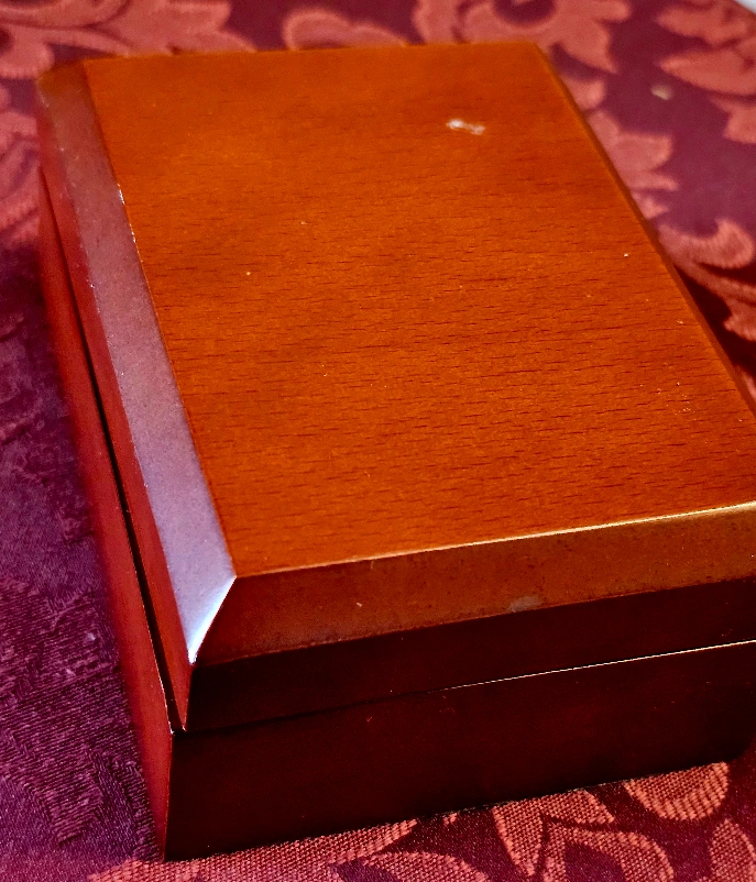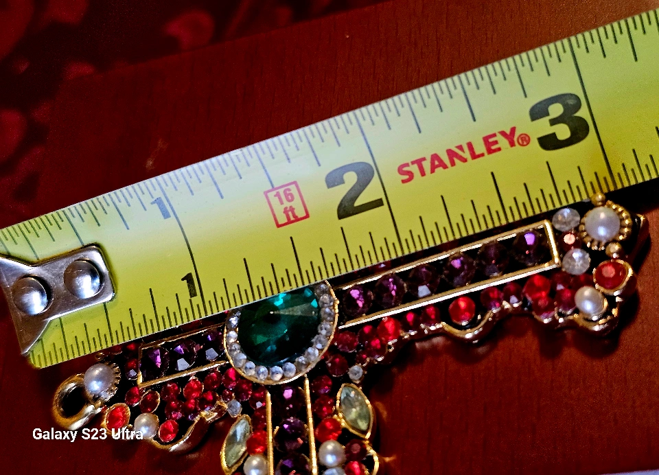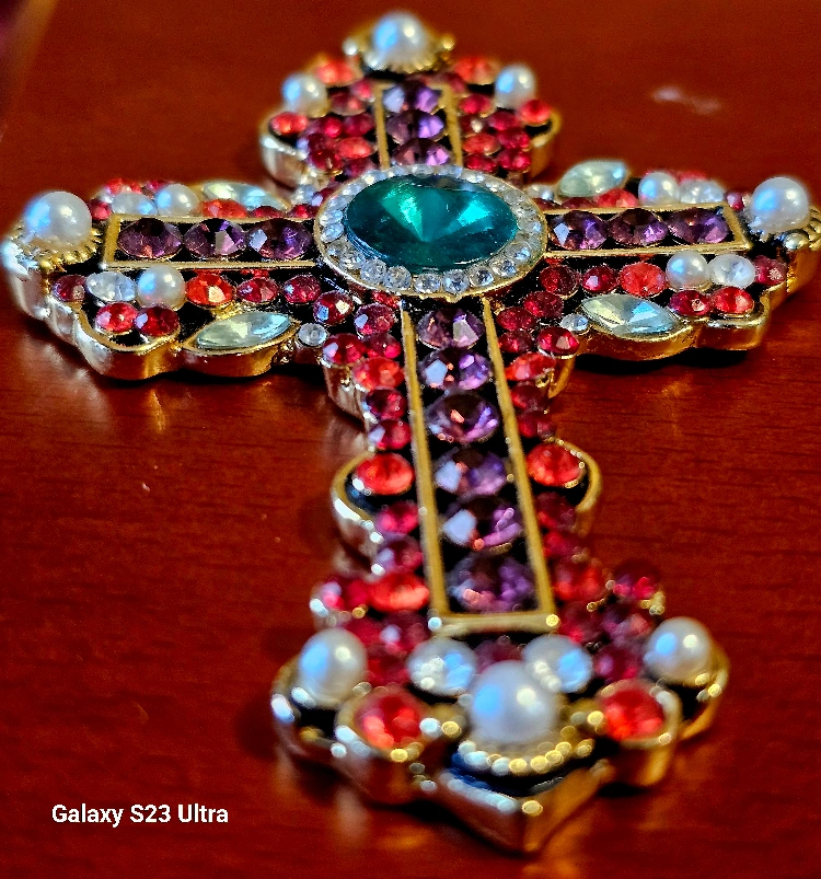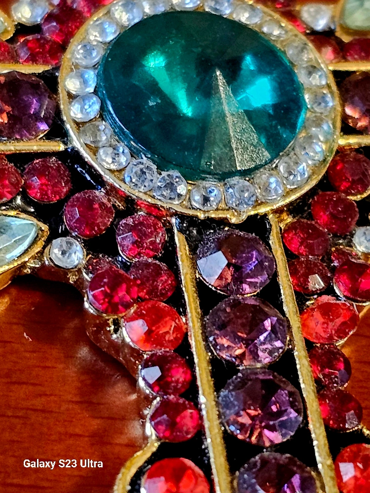 10This is a beautiful vintage Italian cross pendant. It features red, purple, and green jewels, as well as faux pearls. It comes in a wooden box.