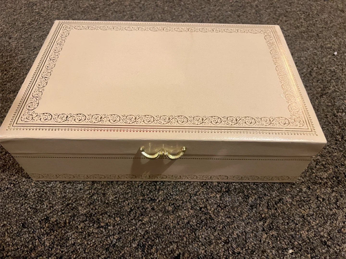 Selling a vintage jewellery box. It has a beautiful design and is perfect for storing your precious items. It has a handle and multiple compartments inside ( 13”x8” and 3/5” high)