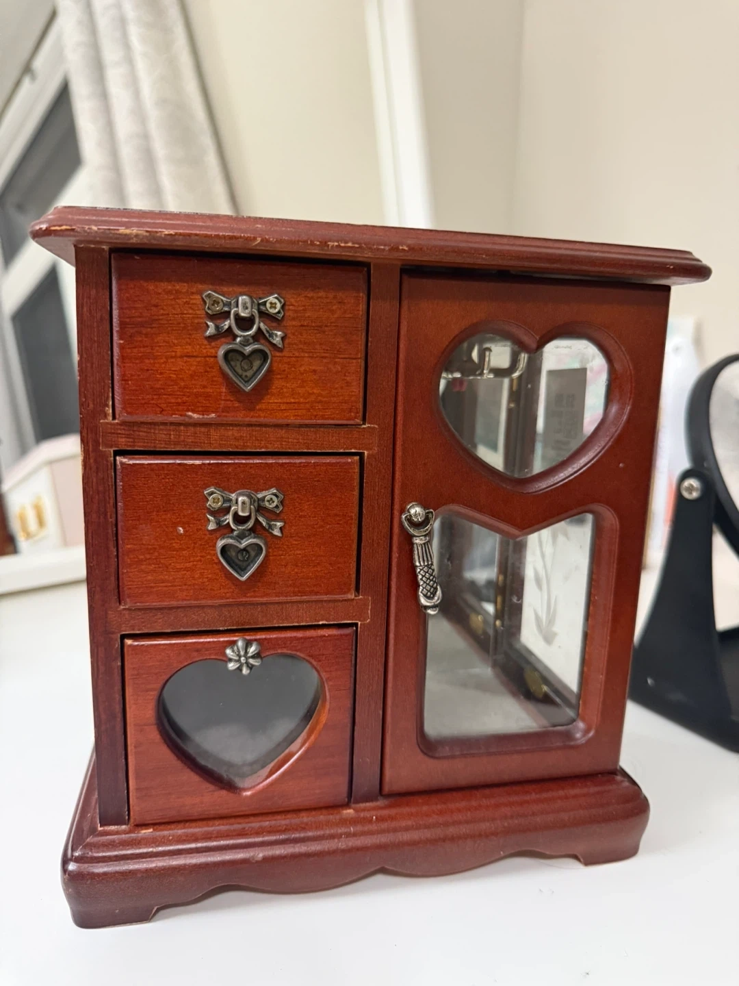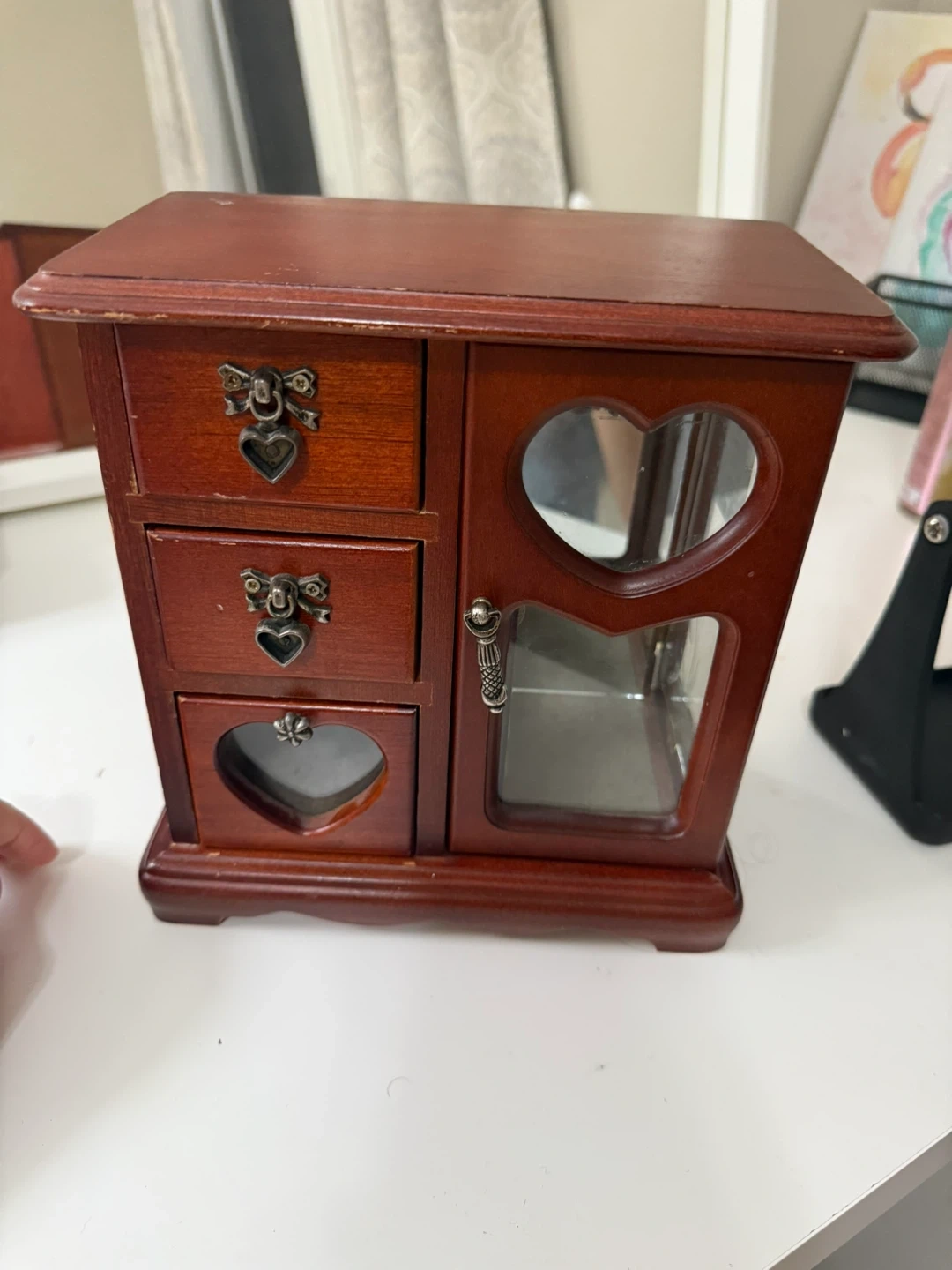 10Here's a cute wooden jewelry box cabinet! It has three drawers and a cabinet with a heart-shaped window. It's perfect for storing your rings, necklaces, and other small treasures. It's in good condition with some minor wear on the top.