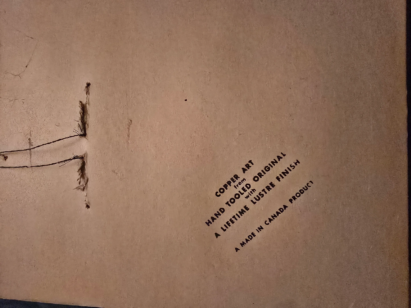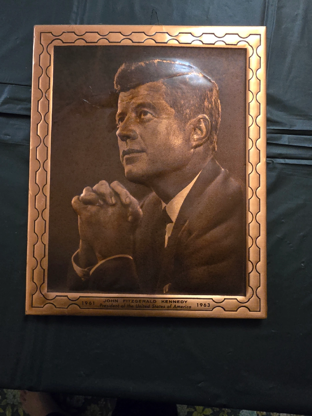 39Material: Copper with a lifetime lustre finish Markings: “Copper Art from Hand Tooled Original – Made in Canada” (stamped on the back) Era: Likely produced in the 1960s as a commemorative tribute Condition: Great vintage condition with minor age-related wear, showcasing its authentic patina and character A stunning collectible piece of mid-century craftsmanship—perfect for history enthusiasts, JFK collectors, or vintage décor lovers.
