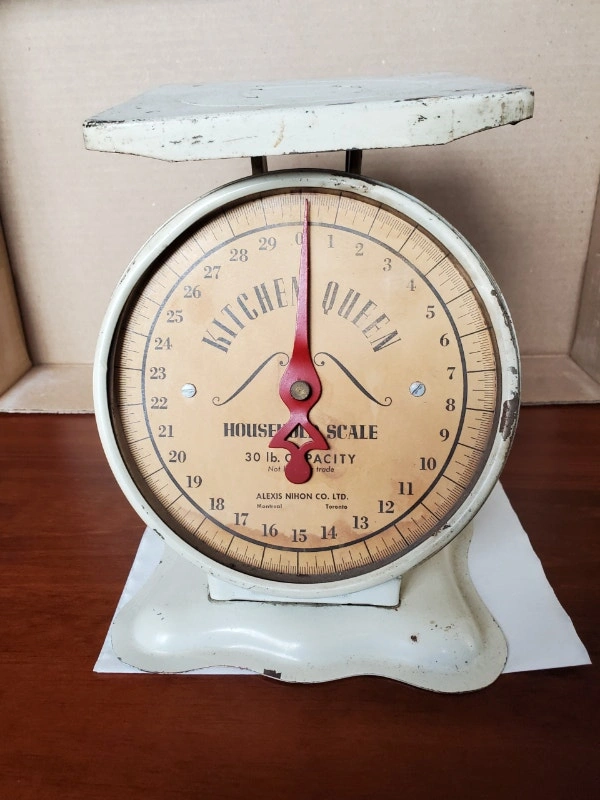 0A vintage Kitchen Queen household scale. It's pretty beat up, but still cool looking. Stands about 8.25" tall, a paper scale face (no glass). $5.00, pick up only