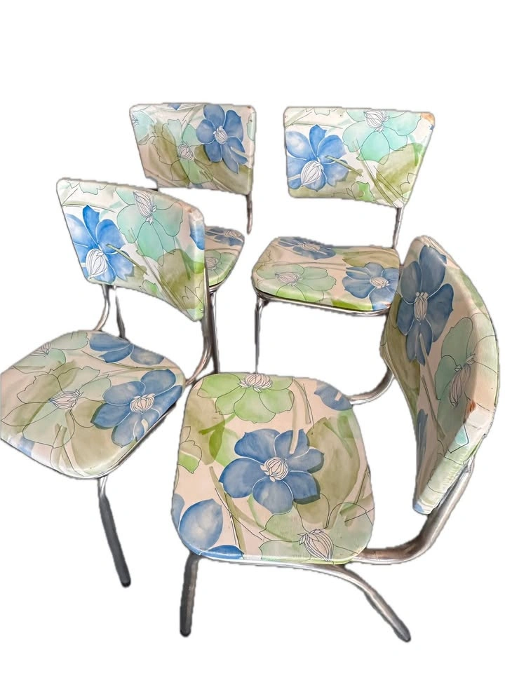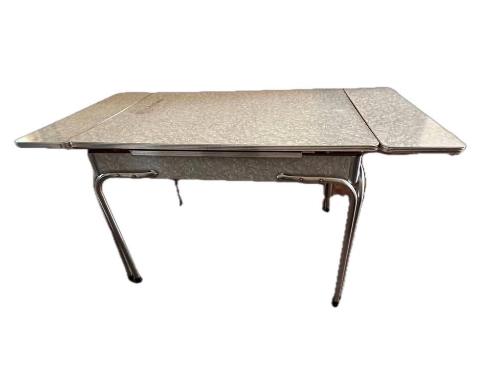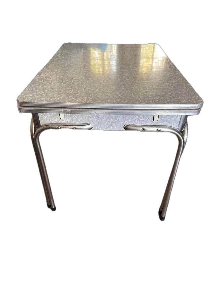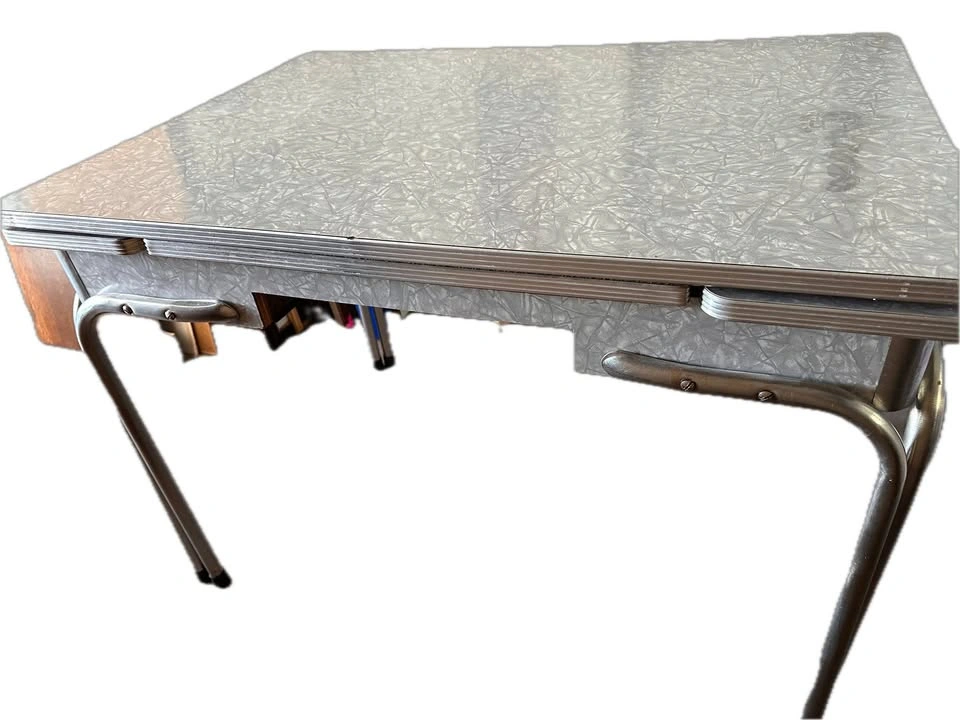 Retro Vintage Kitchen table with extended leaves and 4 chairs. Chairs need work. 2 chairs are in good condition, 2 chairs need new seat wood frame, all metal chair framework is in good condition. Table is in good condition.