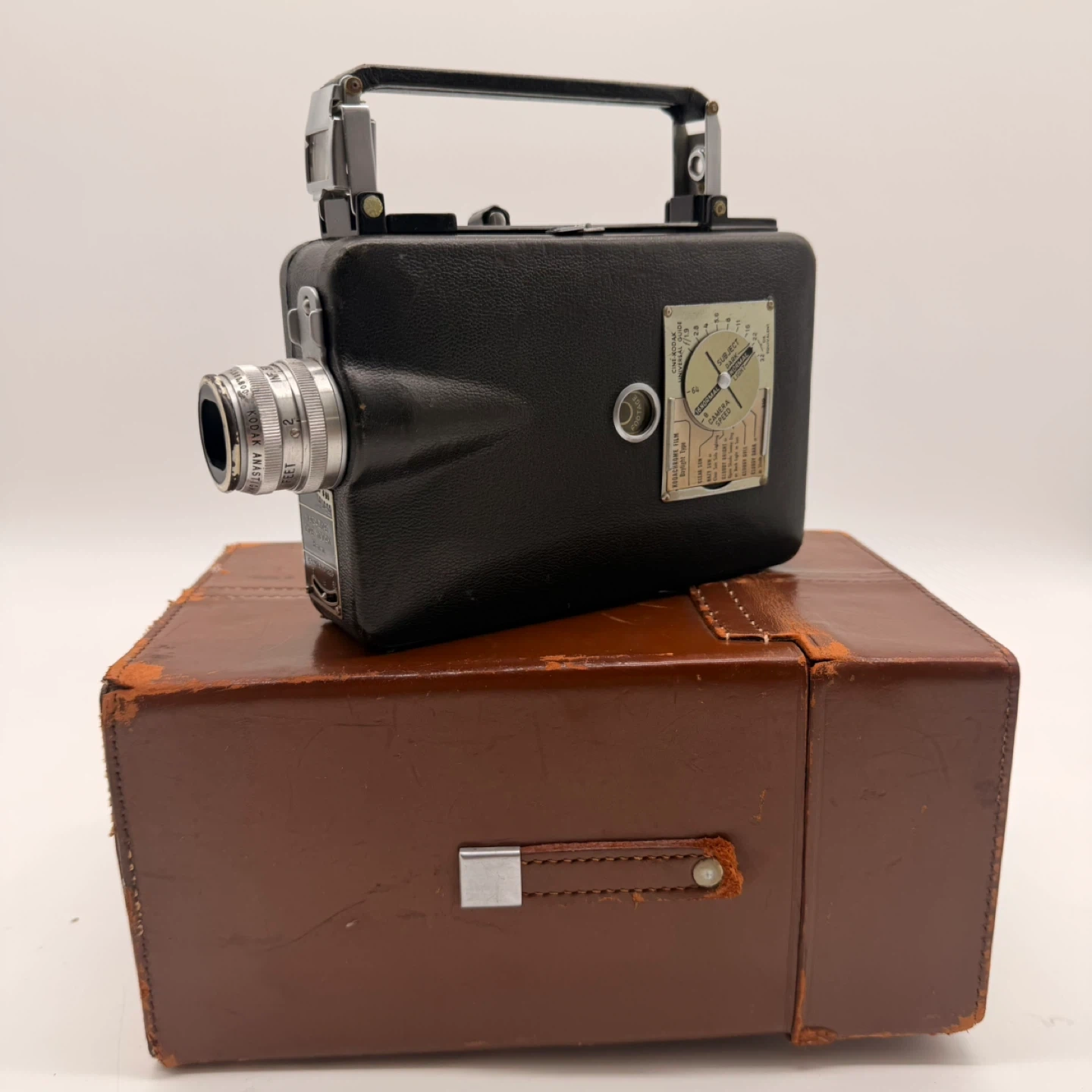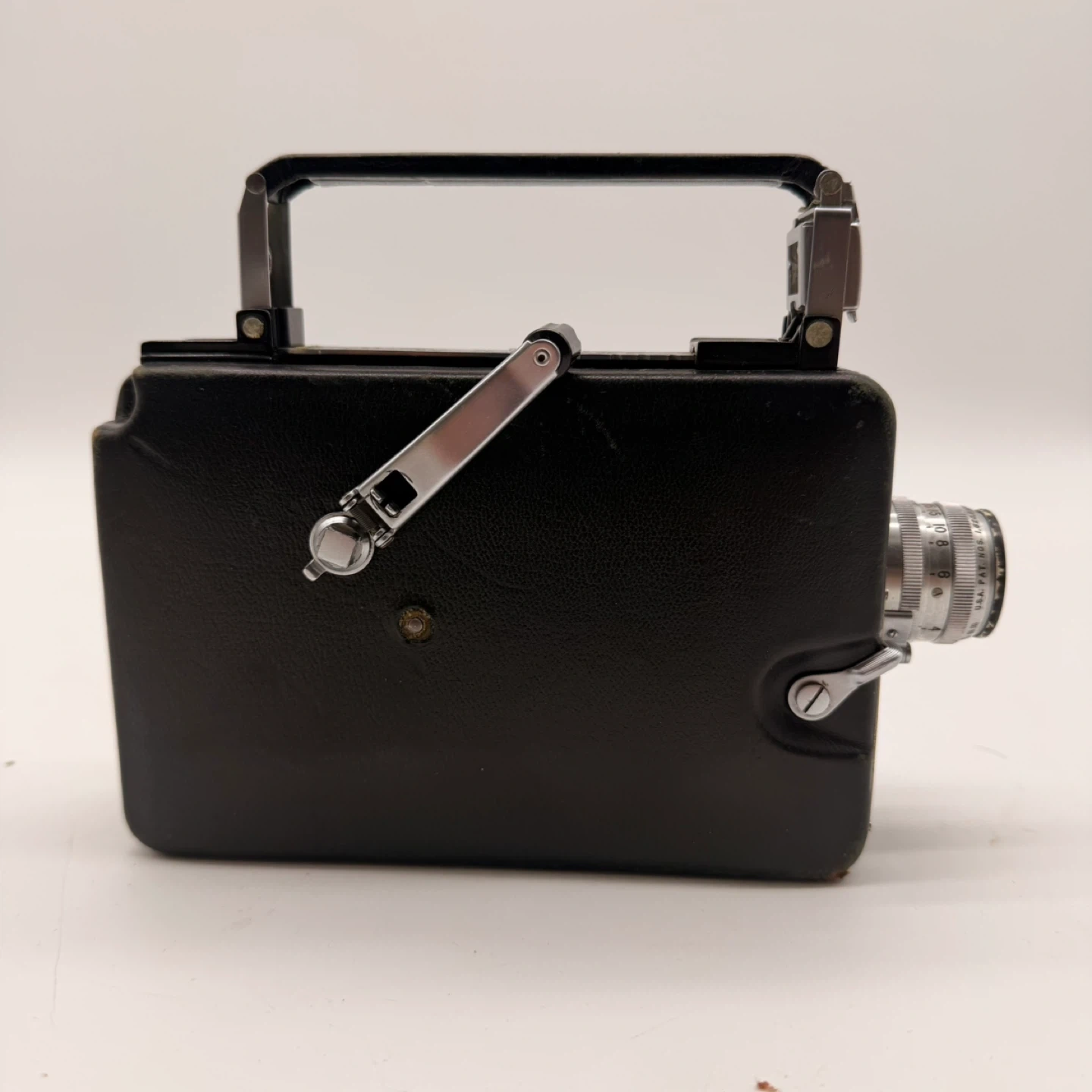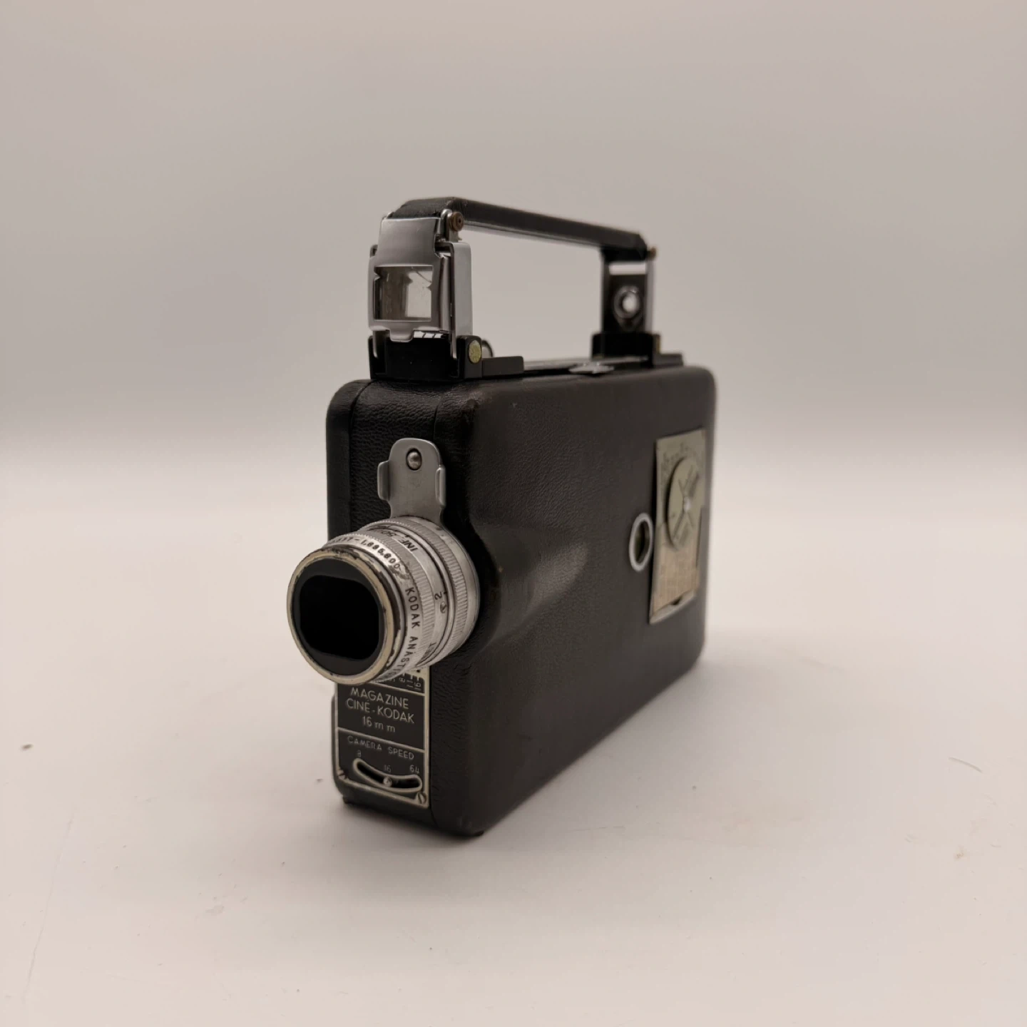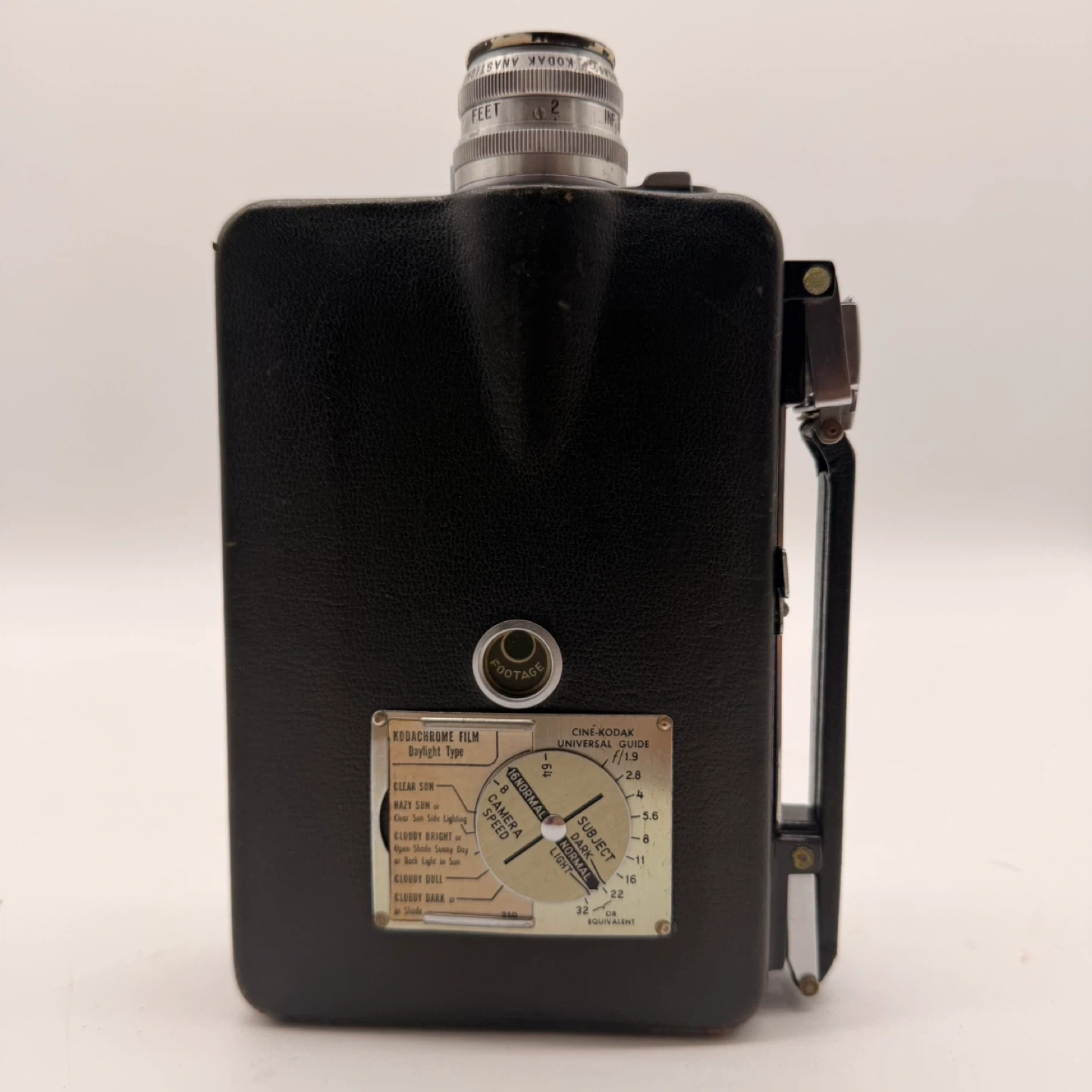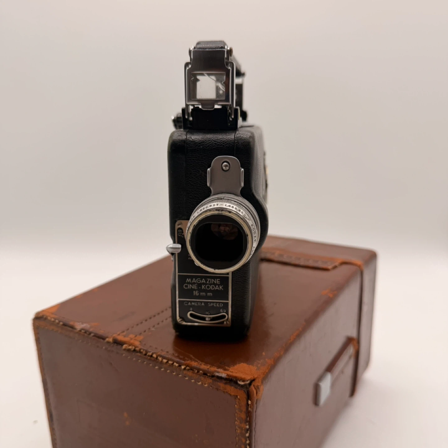 Step back in time with this stunning Magazine Cine-Kodak 16mm movie camera, a mechanical masterpiece from Eastman Kodak Co., Rochester, New York. This mid-century camera was designed for 16mm film and features a durable black metal body, built-in handle, and Kodak Anastigmat f/1.9 lens. Includes its original brown leather case, showing authentic age wear. Perfect for collectors, photography décor, or vintage film enthusiasts. ⚙️ Condition: Untested, sold as-is. 1392 ca