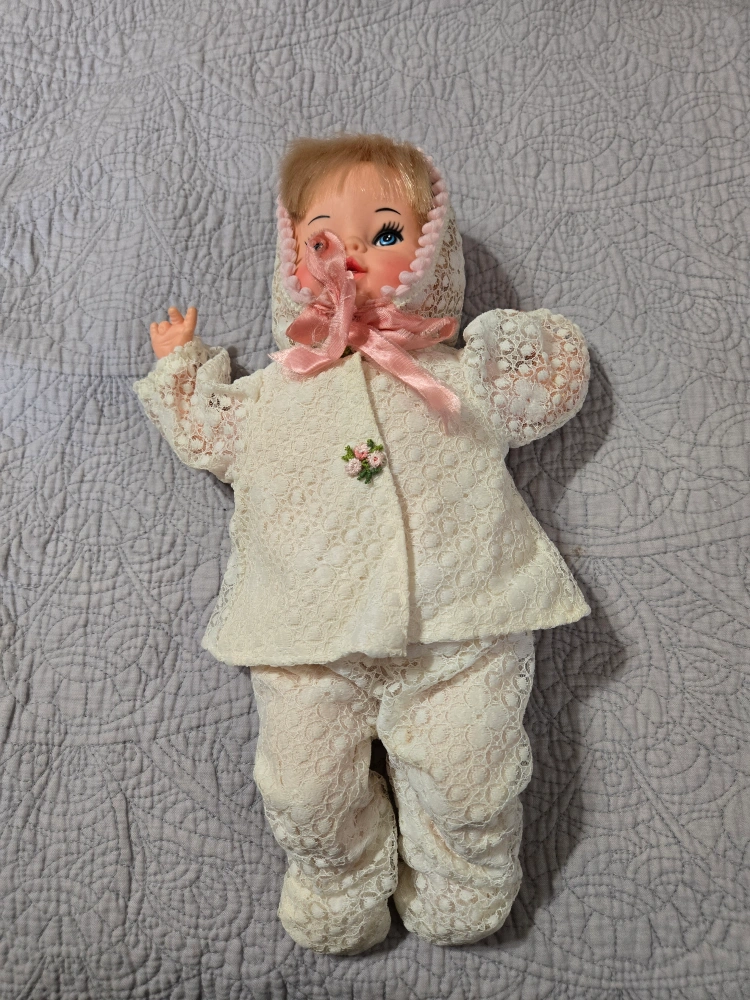 A cute vintage baby doll with a lace outfit. It's in great condition and ready for a new home! The doll features a lace bonnet with a pink ribbon and a matching lace outfit with a small floral detail