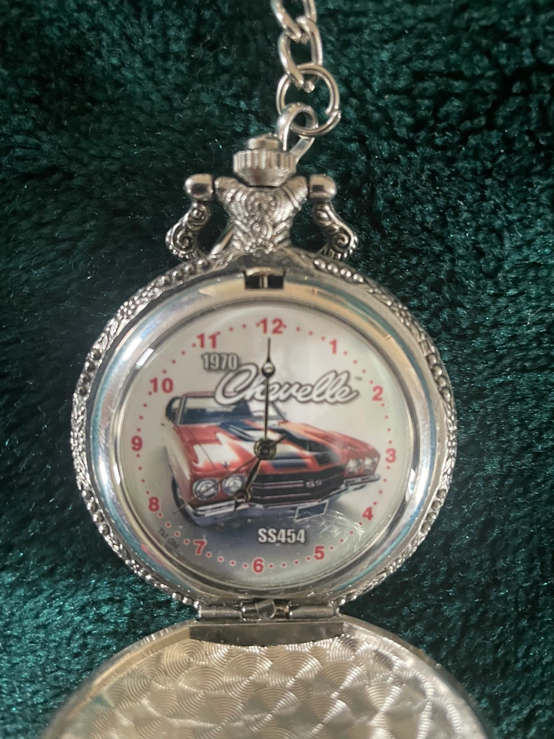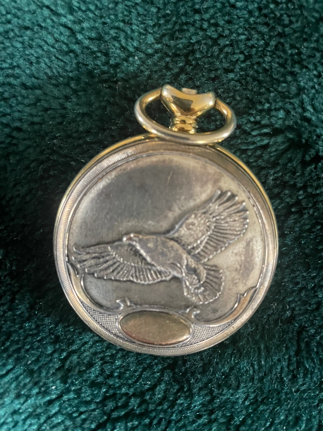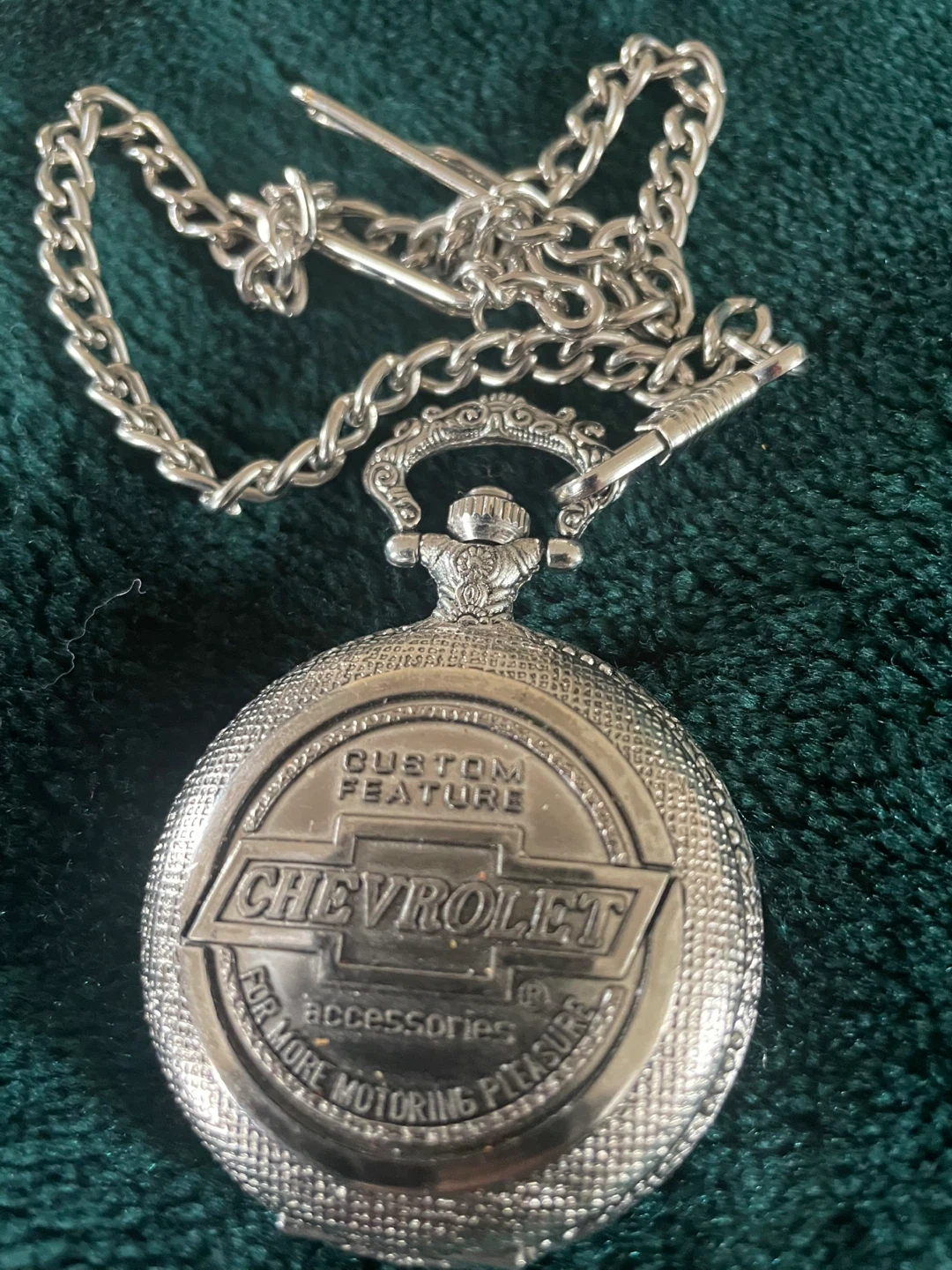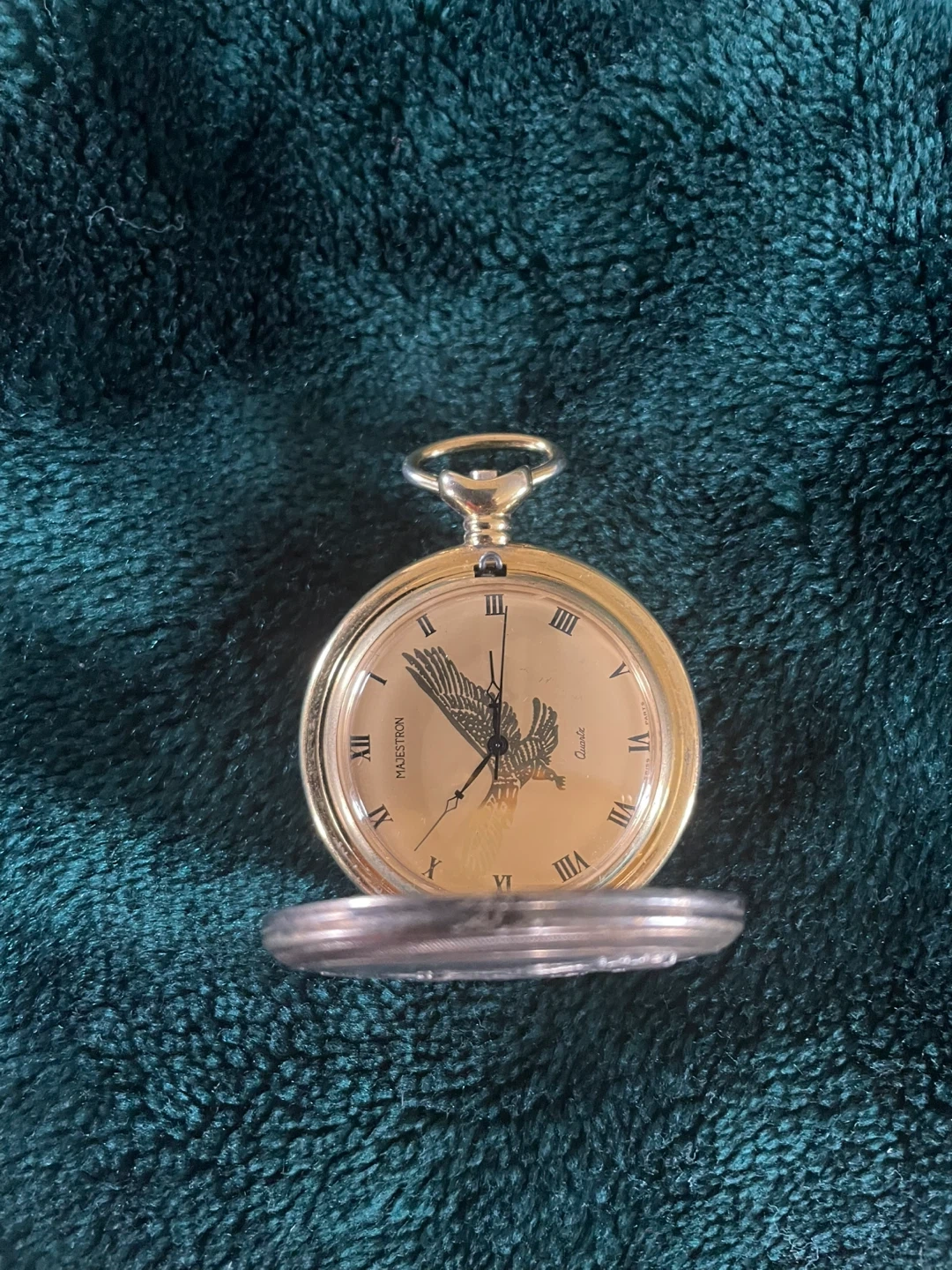 Selling a vintage Maestro pocket watch. It features a unique design with an eagle on the front. The watch comes with a chain, adding to its classic appeal. Also including a Milan Quartz pocket watch with chain and a Chevrolet pocket watch as well