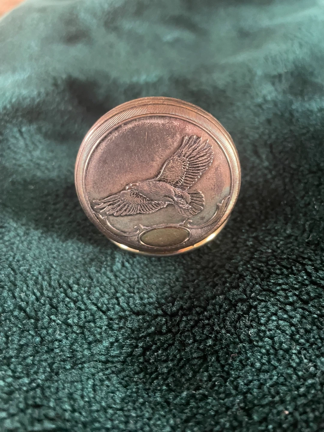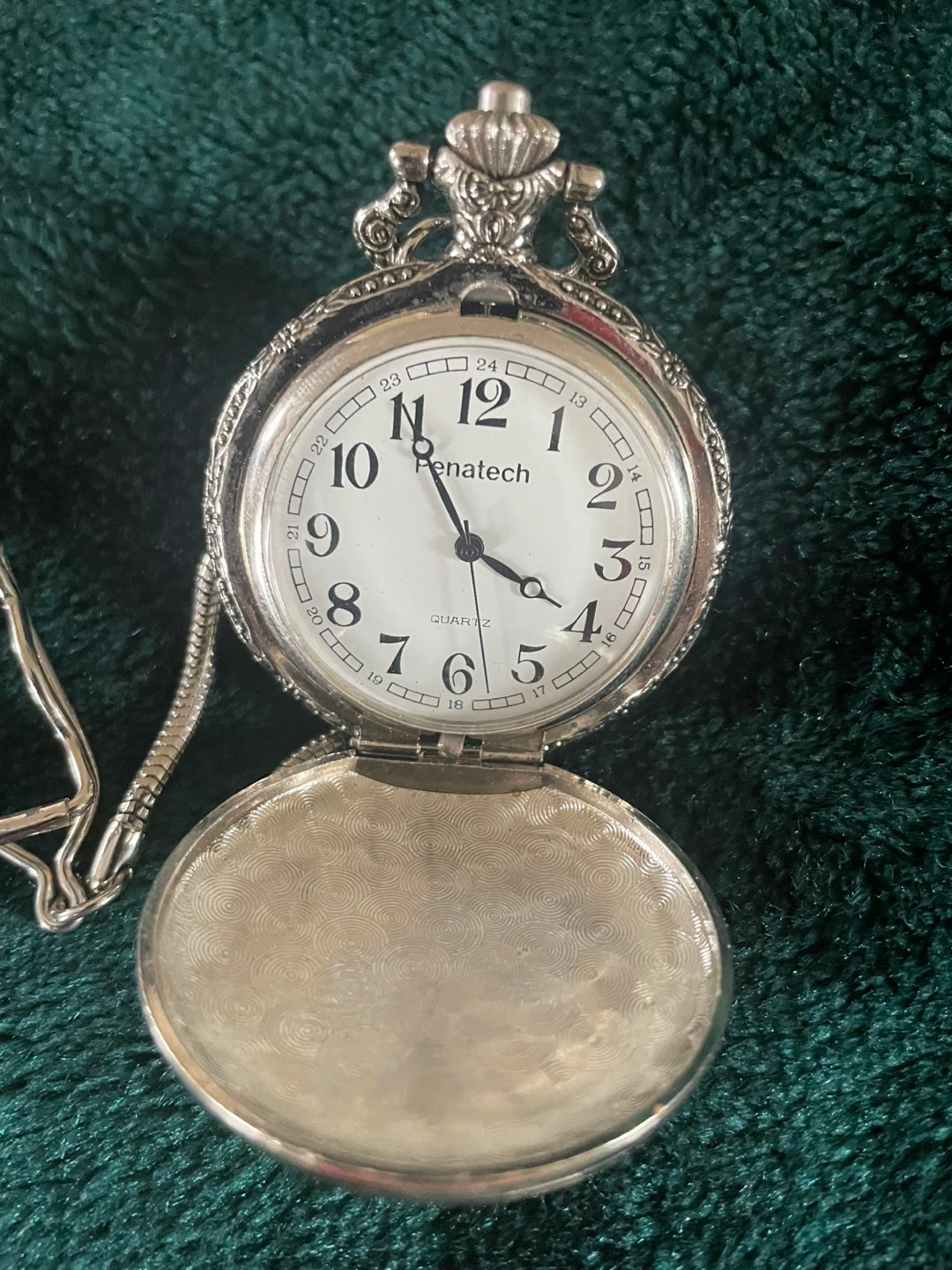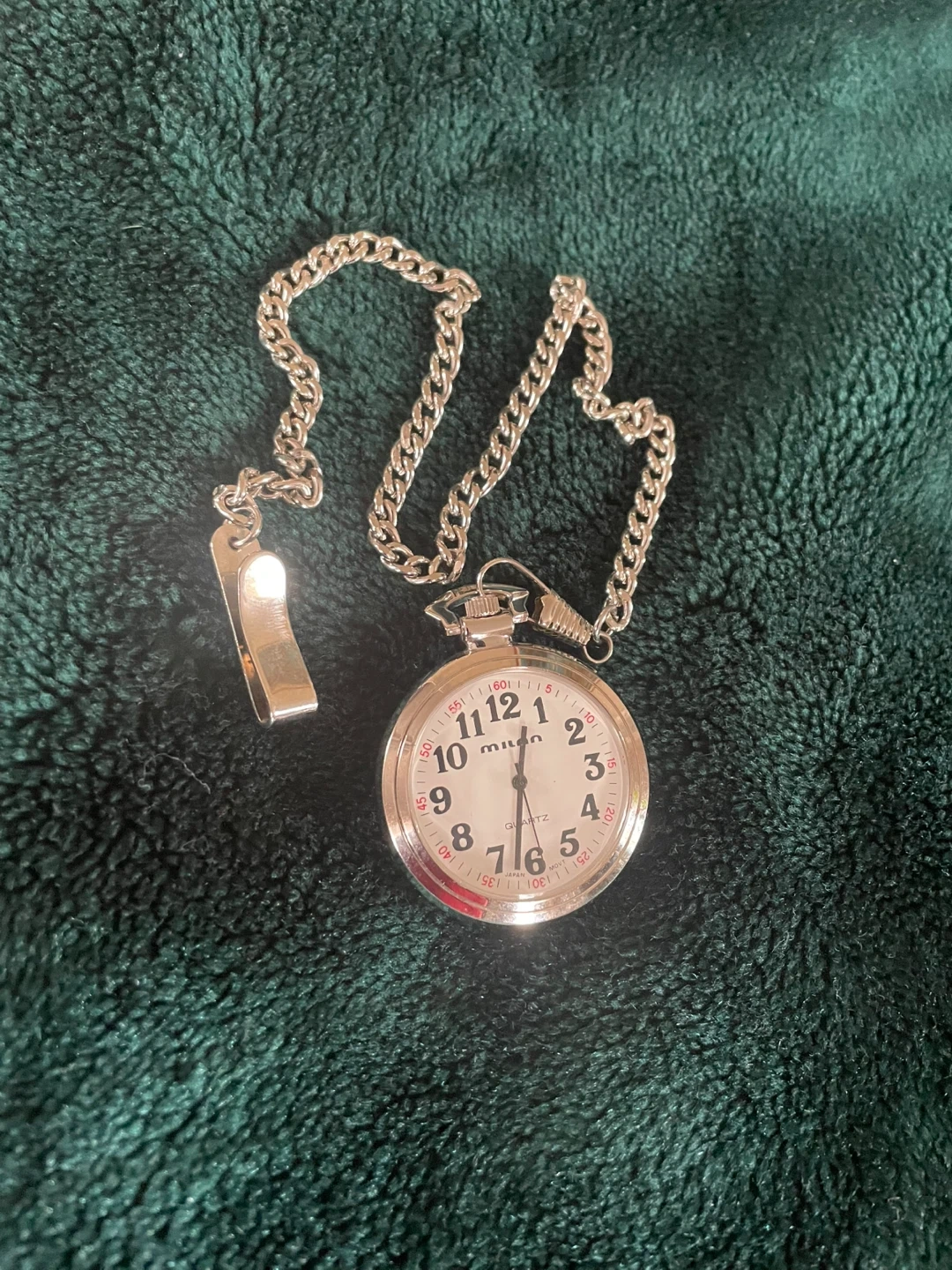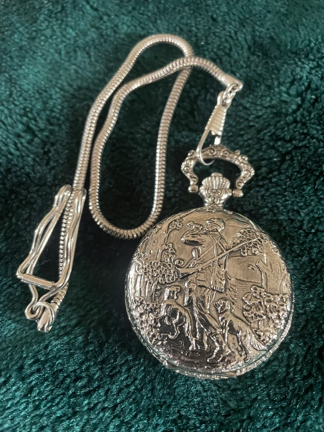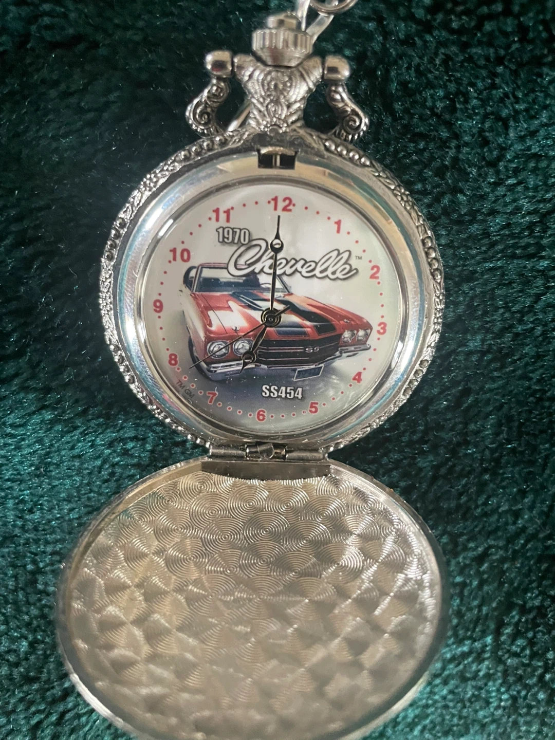 Selling a vintage Maestro pocket watch. It features a unique design with an eagle on the front. The watch comes with a chain, adding to its classic appeal. Also including a Milan Quartz pocket watch with chain and a Chevrolet pocket watch as well