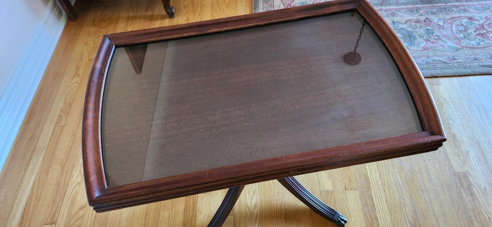 Selling a lovely vintage mahogany butler table! It's in great shape and would be a beautiful addition to any room. The wood has a rich, warm tone, and the glass top adds a touch of elegance. A classic piece!