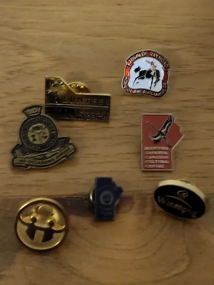 134Selling a collection of vintage pins! Includes pins from Manitoba (Japanese Canadian Cultural Centre, Buddhist Association) and the Town of Raymond. Also includes a West Thunder Community Centre Volunteer pin and a Winnipeg pin.