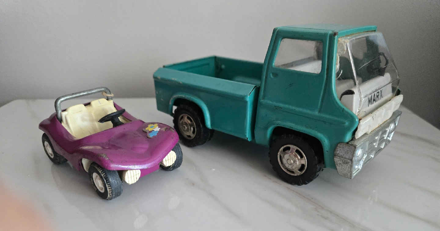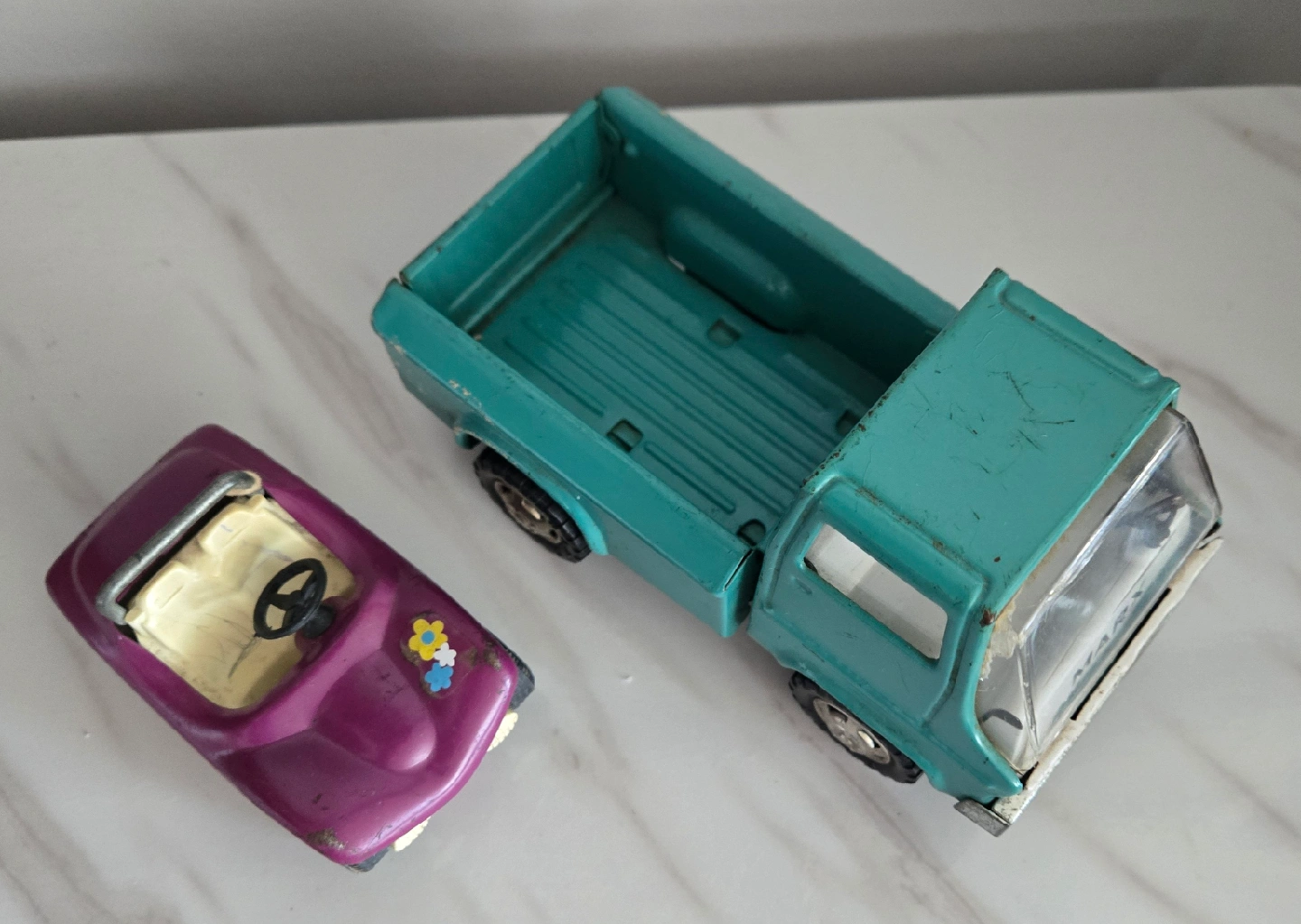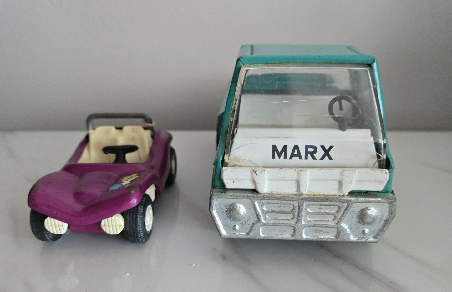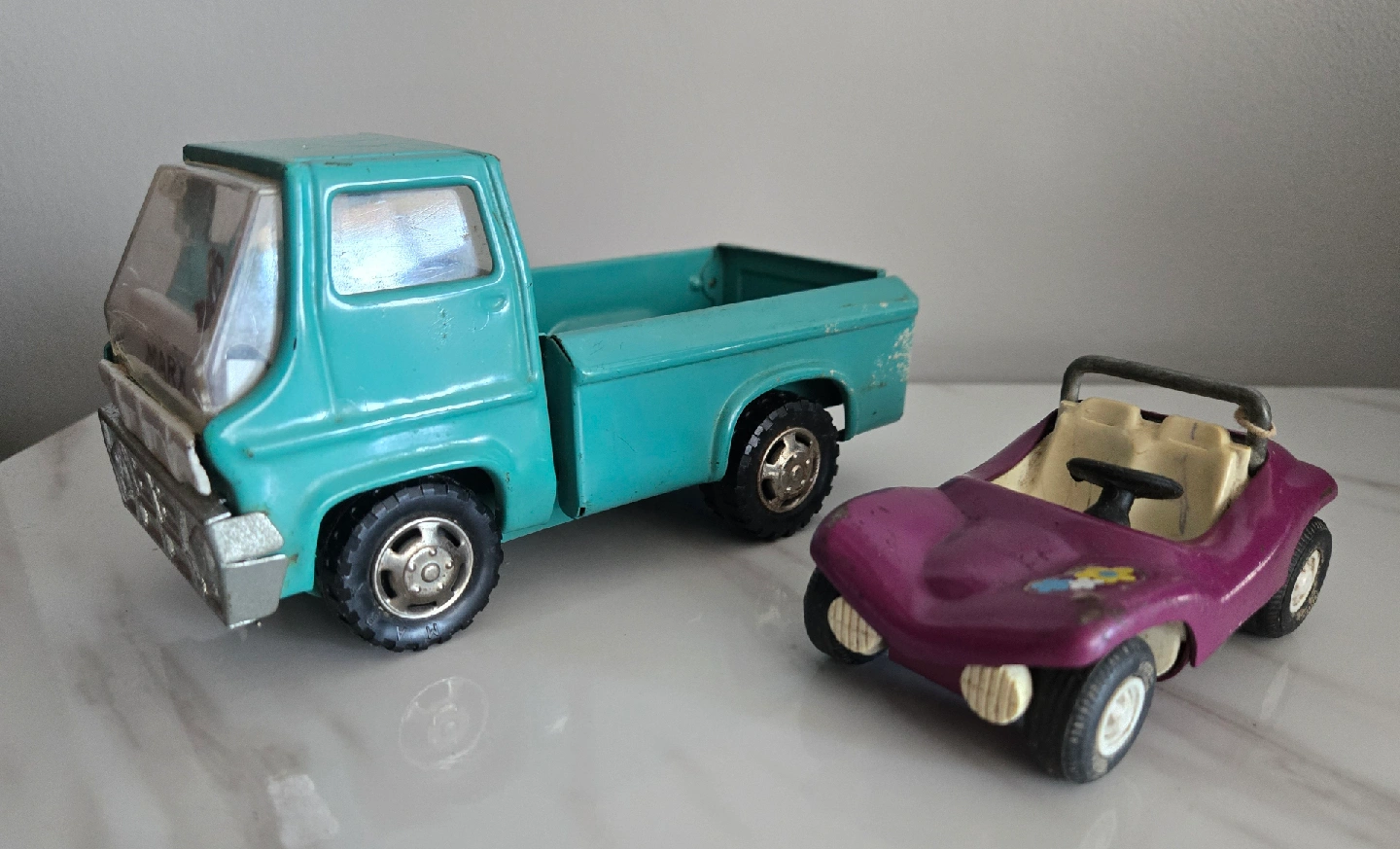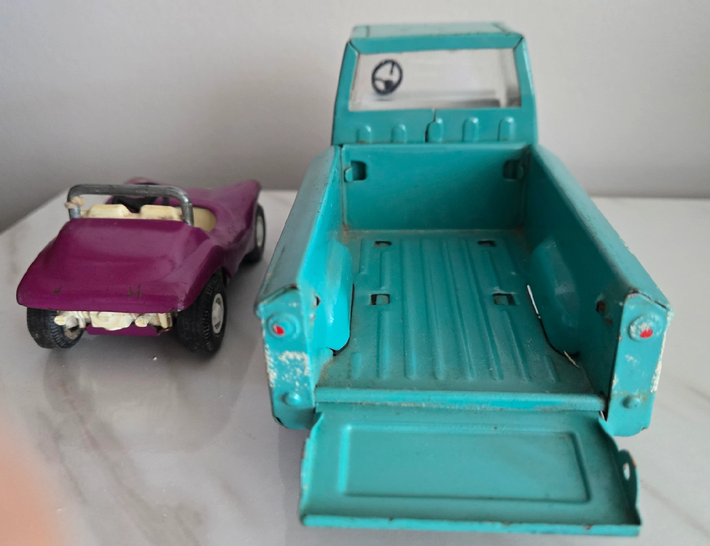 Selling a couple of vintage tin toy cars! There's a turquoise-coloured 1968 Marx truck and a 1970 Tonka Dune buggy. Both have been played with, but still in great condition.