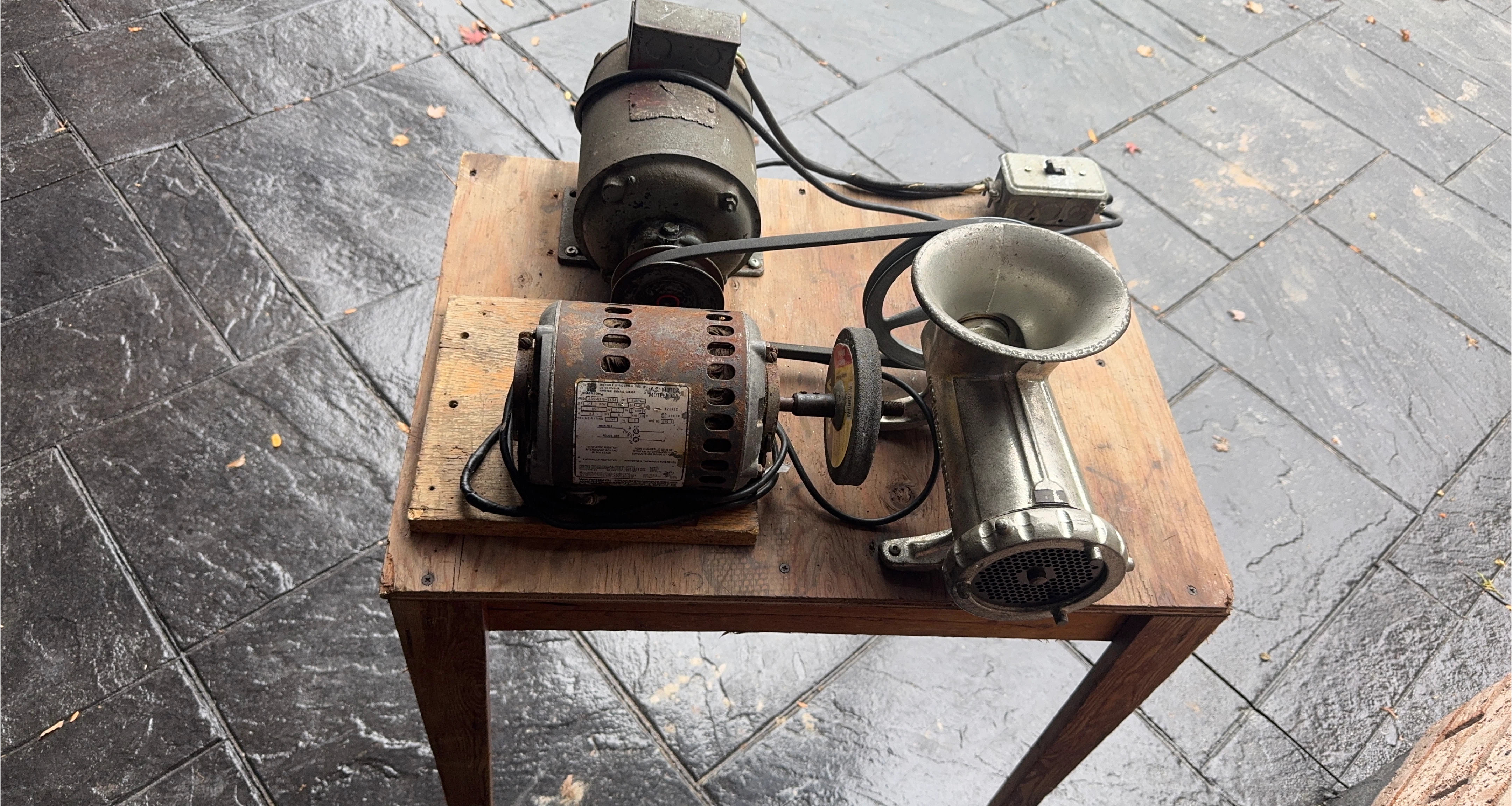 Selling a meat grinder that comes with a motor. It's mounted on a wooden table