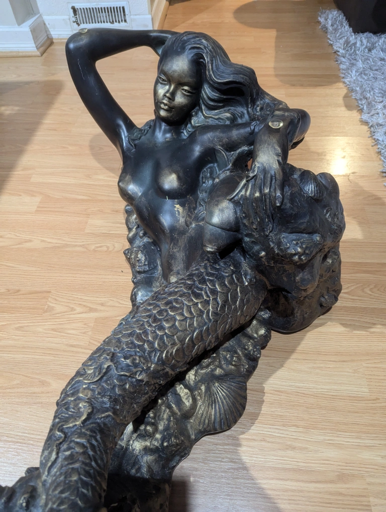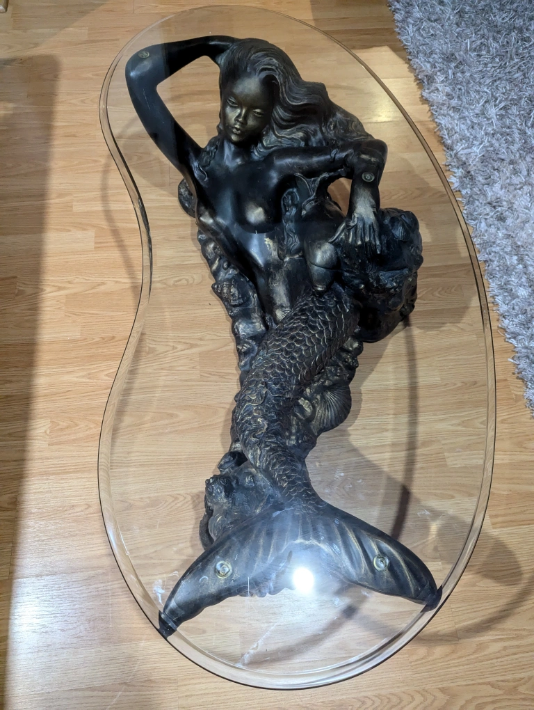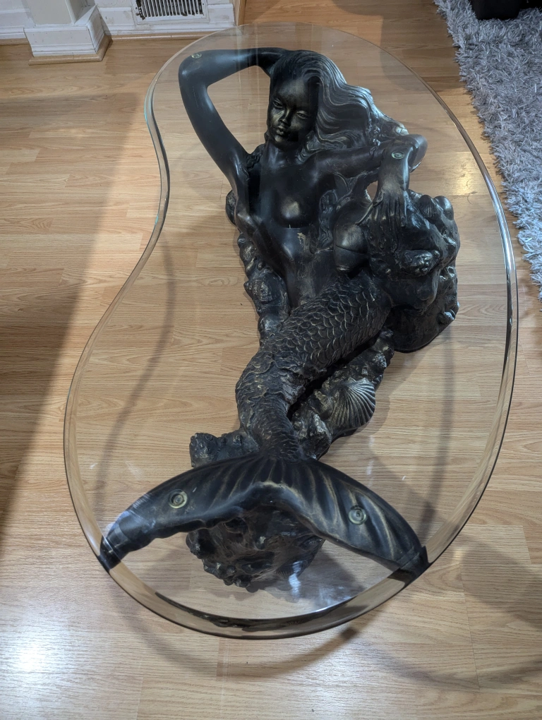 Rare and eye-catching coffee table featuring a stunning mermaid sculpture base, perfect for those looking to blend art with functionality in their home decor. Measuring L 49" x W 22" x H 16", It comes with a thick, scratch-free glass top that beautifully showcases the intricate details of the mermaid design