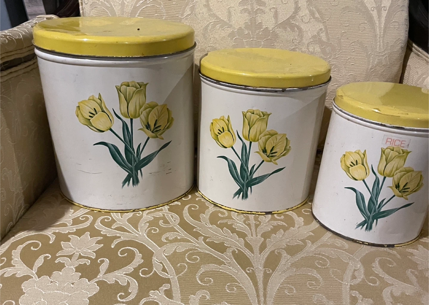 47Here's a cute set of 3 vintage metal canisters! They have a yellow tulip design and yellow lids. They would add a touch of vintage charm to any area.