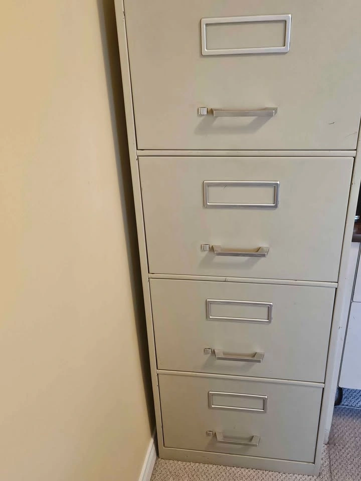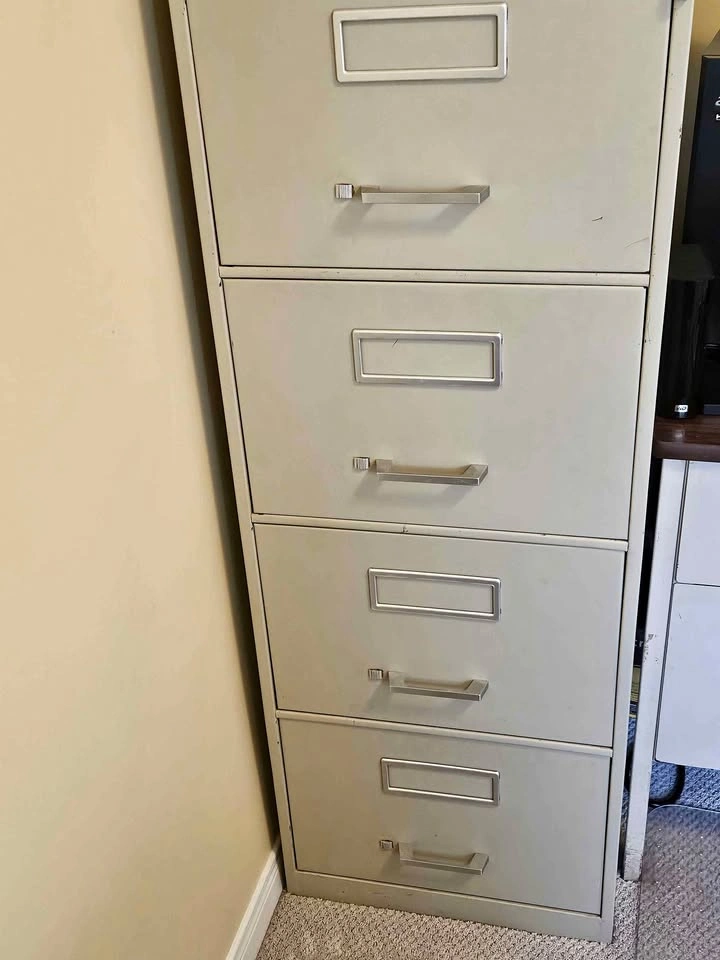 19Here's a sturdy vintage metal filing cabinet with four drawers. It's perfect for organizing your documents and adding a touch of retro charm to your office or workspace. This filing cabinet is in good condition and ready to use! 18" x 28" x 51"