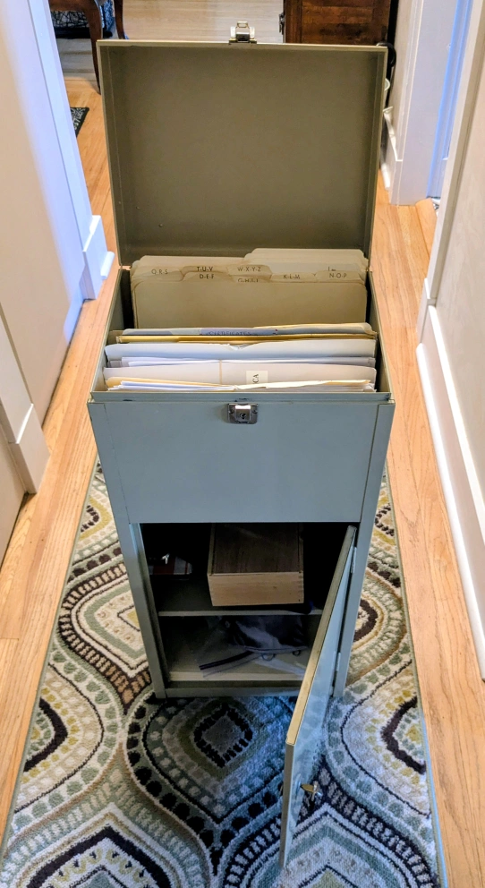 This vintage metal filing cabinet is perfect for organizing your documents and adding a touch of retro style to your home or office! Beige cabinet that locks files up top and also a lock on the door to an inner compartment with shelf. Measures 30.5"H x 13" W x 10" D Price is firm
