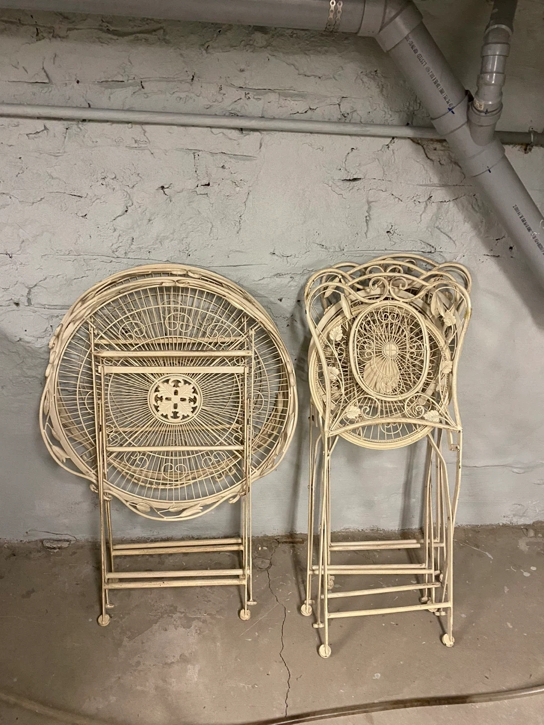 10Selling a charming vintage metal folding table and chair set. This set is perfect for adding a touch of retro elegance to your patio or garden. The intricate design and folding feature make it both beautiful and practical for smaller spaces 2tables and 3chairs 1tables and 2chairs for 40