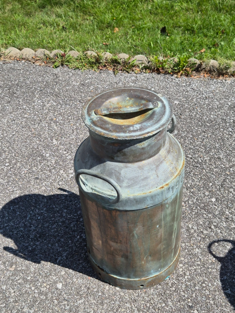 Selling a vintage metal milk can. It has a unique look and would be great as a decorative piece!