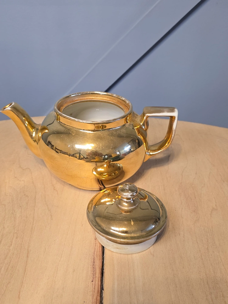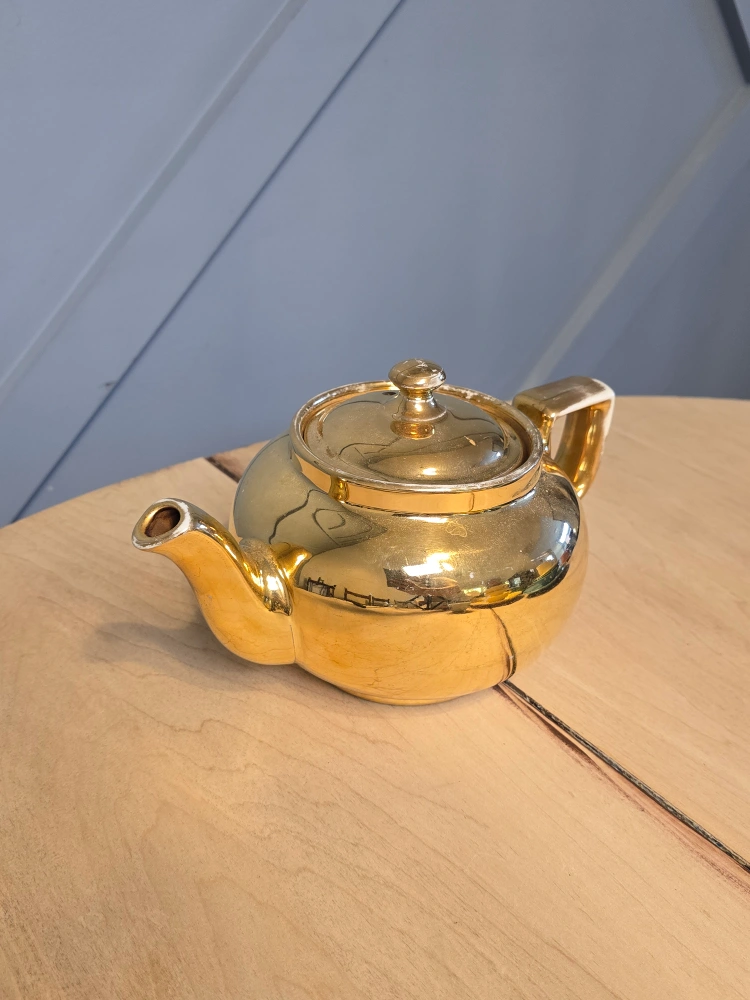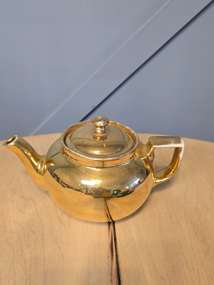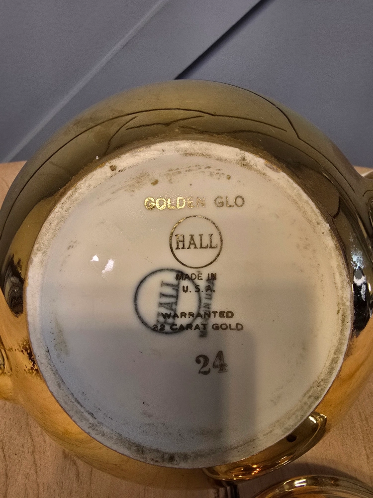 Vintage Mid Century Hall China Golden Glo 22K Teapot Beautiful, vintage porcelain teapot by Hall China in their 22K Golden Glo design. This elegant mid century teapot has an all over gold finish and white interior which would beautifully compliment most contemporary tea sets. The teapot measures 5 inches in height x 9 inches in width (including handle). Noticeable wear on gold due to age and use. (See pic). No chips, or cracks.