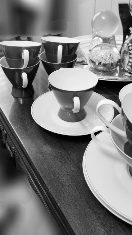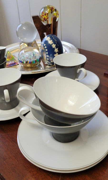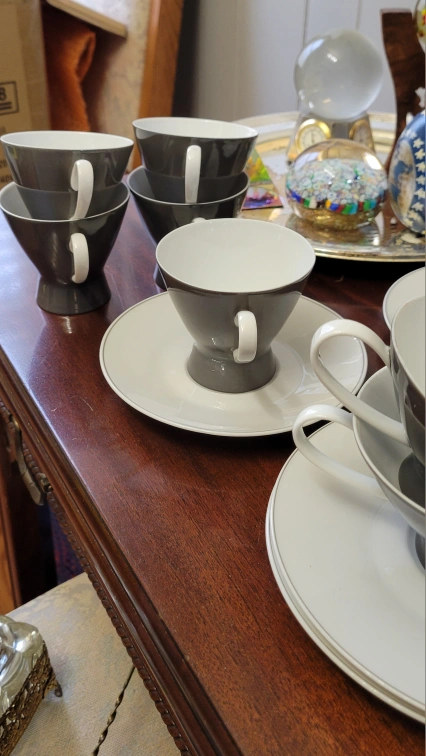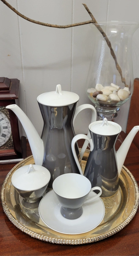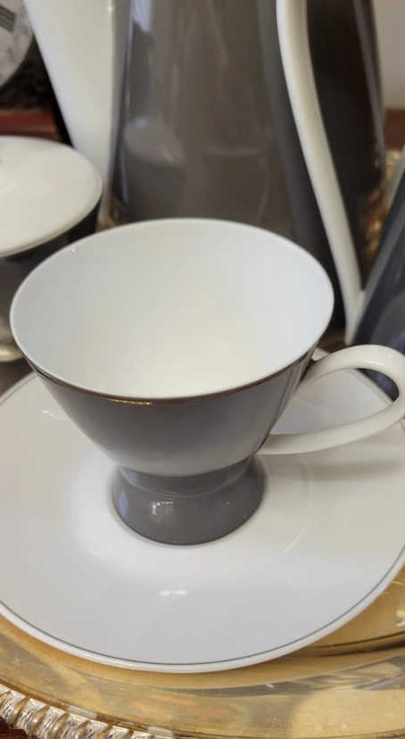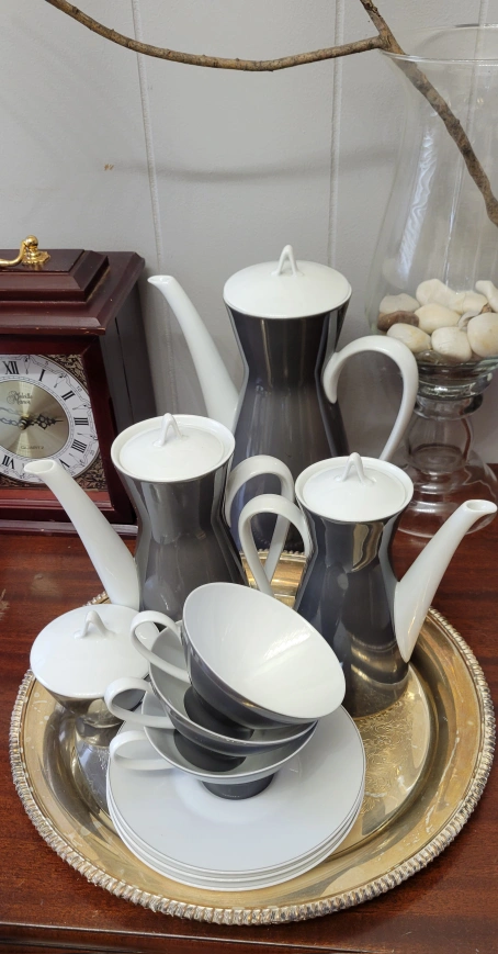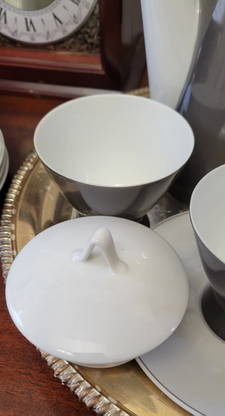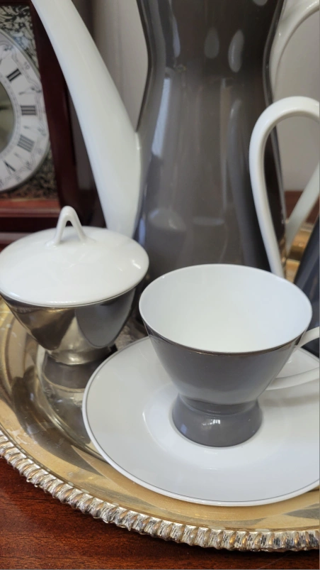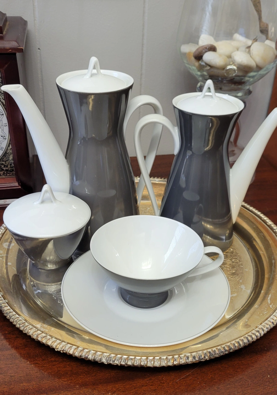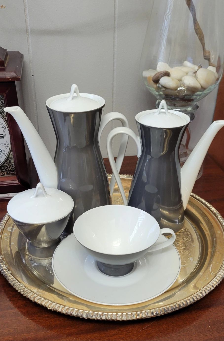 20Beautiful vintage, rare, contemporary tea set by Rosenthal. Designer is Raymond Loewy. Two coffee pots, lidded creamer and sugar bowl, 3 teacups and 3 saucers. Grey and white colour scheme. Elegant design. Perfect for collectors or for adding a touch of retro style to your home. 18 pieces. coffee pot, teaset, 3 teacups with saucers. 6 coffee cups with 2 saucers. Sugar bowl, lidded.